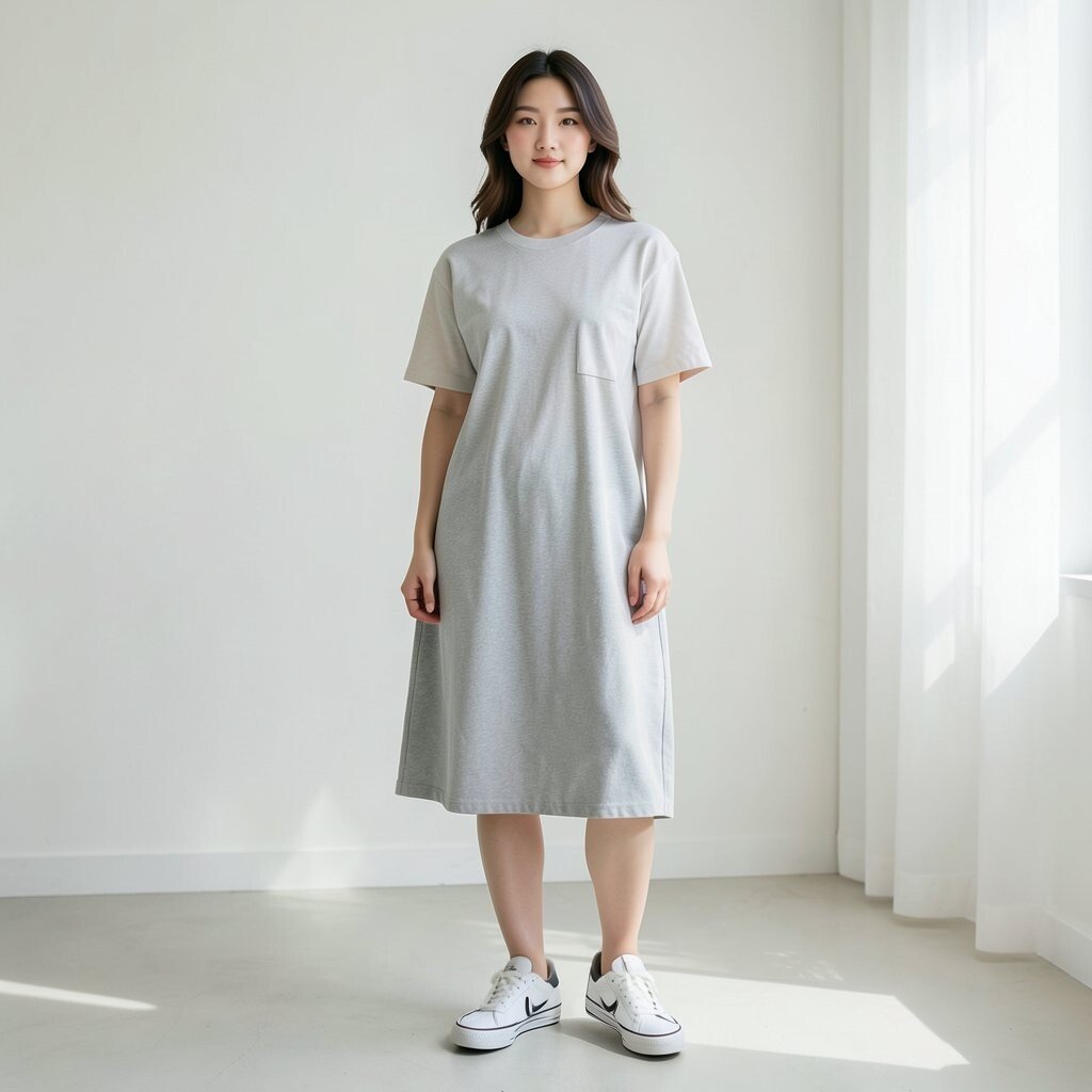 A T-shirt dress with sneakers is one of the easiest Korean outfit ideas to wear. It feels simple, fresh, and very comfortable for active days.