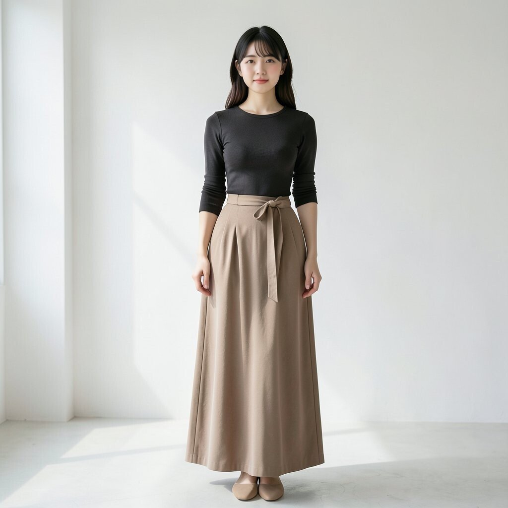 A long skirt with a fitted top creates a balanced and graceful shape. The skirt flows softly, and the fitted top keeps the outfit neat and clean.