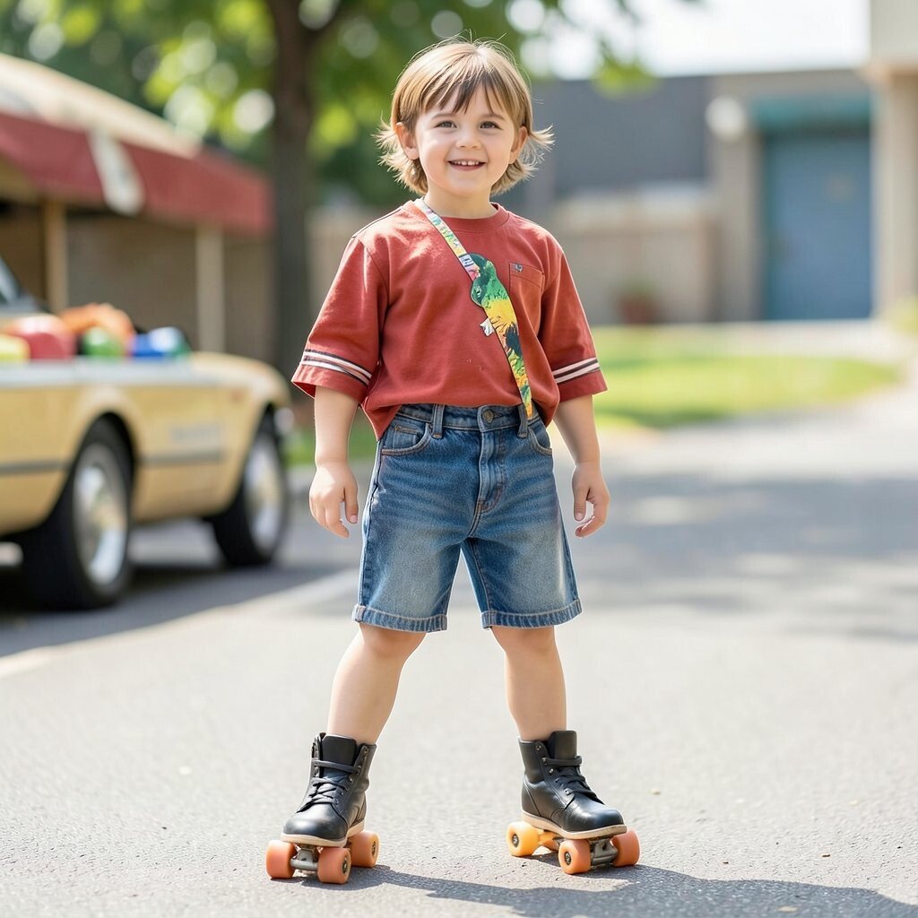 Try high socks, shorts, a striped top, and colorful skates or sneakers. A headband or visor can help the retro mood feel stronger. If you want to keep the outfit simple, just use one bold pattern and one solid color.