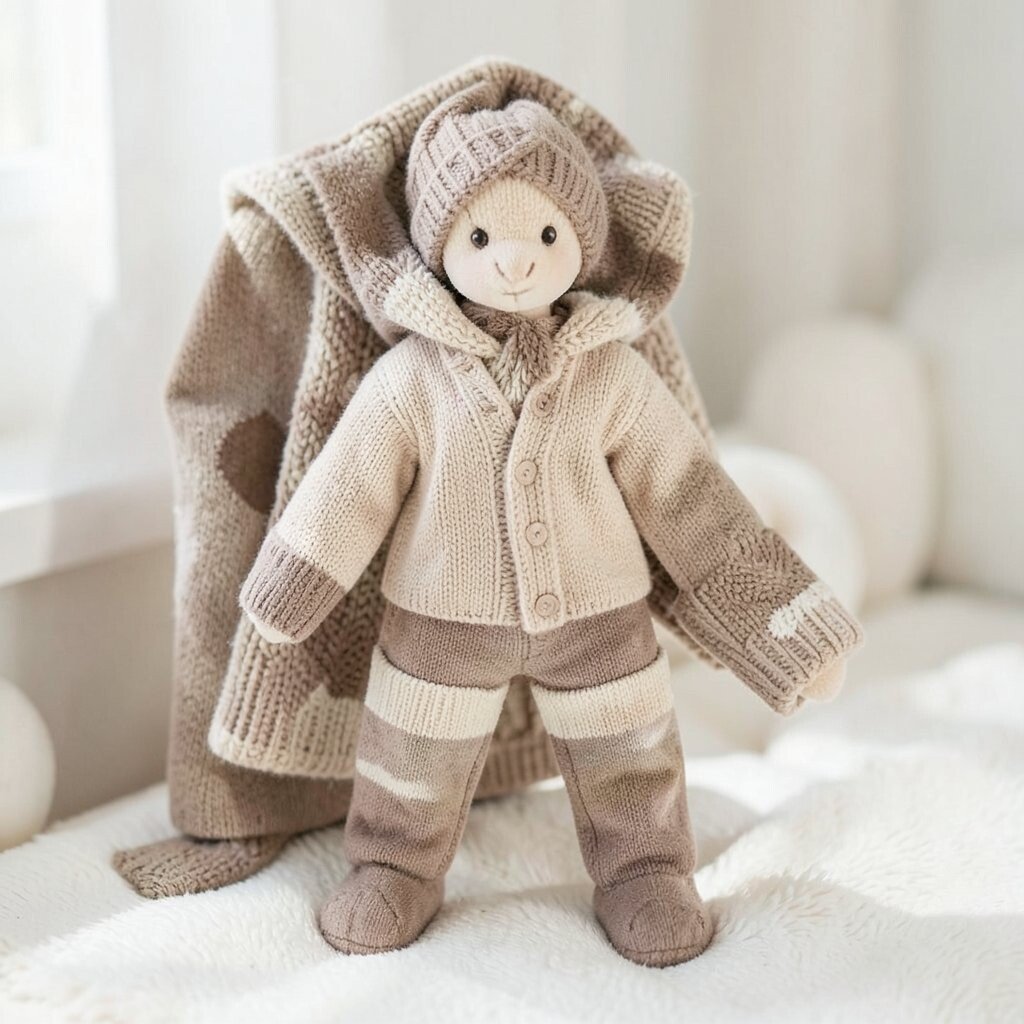 Soft sweaters, warm boots, and fluffy hats make this outfit feel like a snowy day. It gives off a snug and friendly feeling that works well for winter scenes.