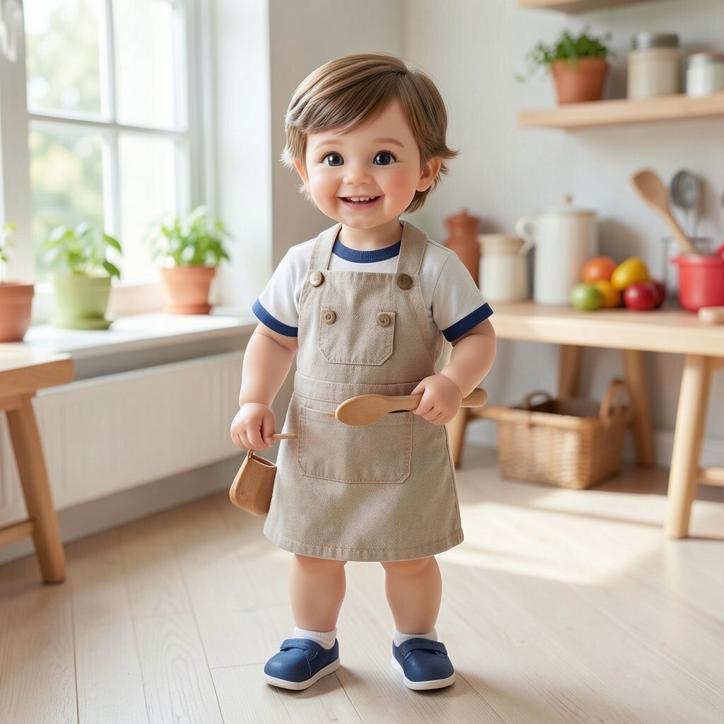 This outfit is cute, funny, and full of story ideas. A chef hat, apron, and simple clothes make the character look ready to cook up something tasty.