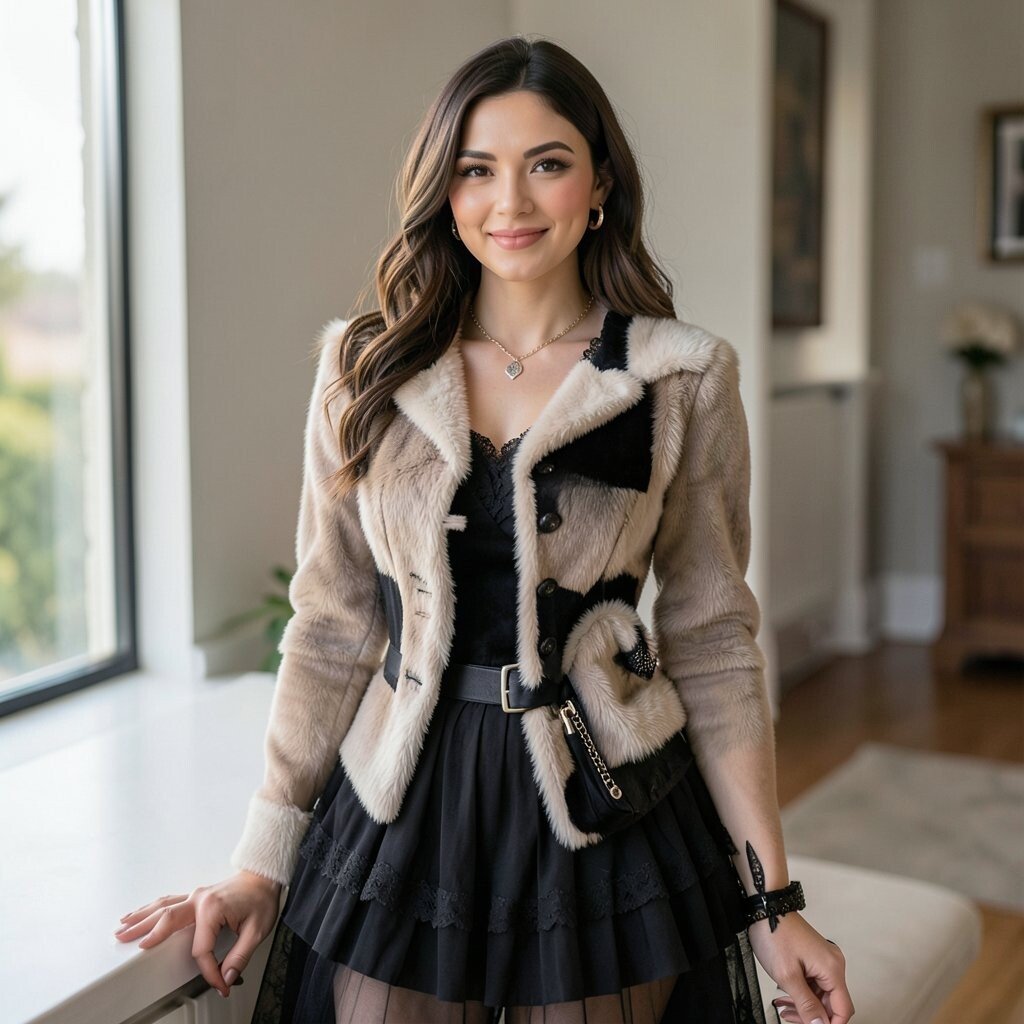 Try a ruffled skirt, lace top, or boots to soften the darker colors. A heart clip or tiny purse can keep the look playful. This outfit can be done on a low cost if you use basic dark pieces and add just one standout item.