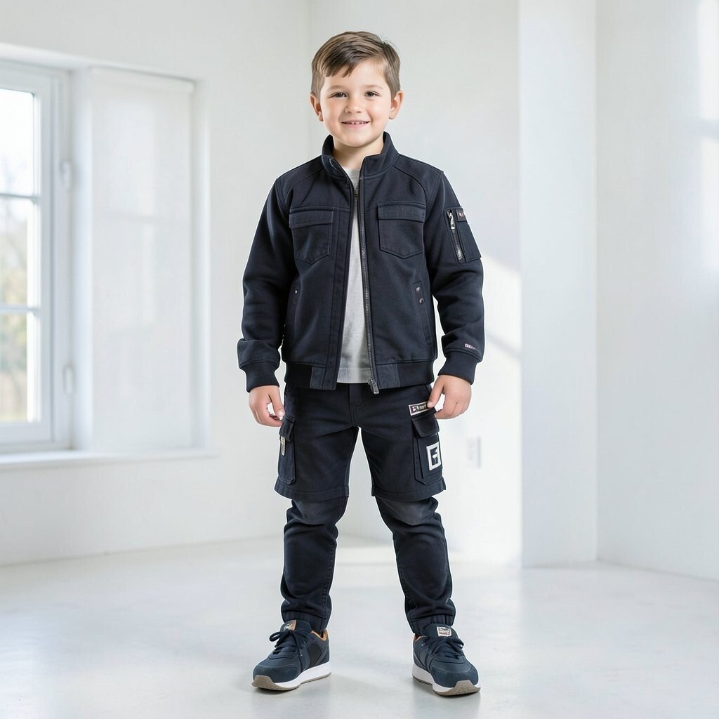 This outfit brings a fast and active feel with a zip-up jacket, leggings, and sneakers. It looks ready for games, walks, or a busy day around town.