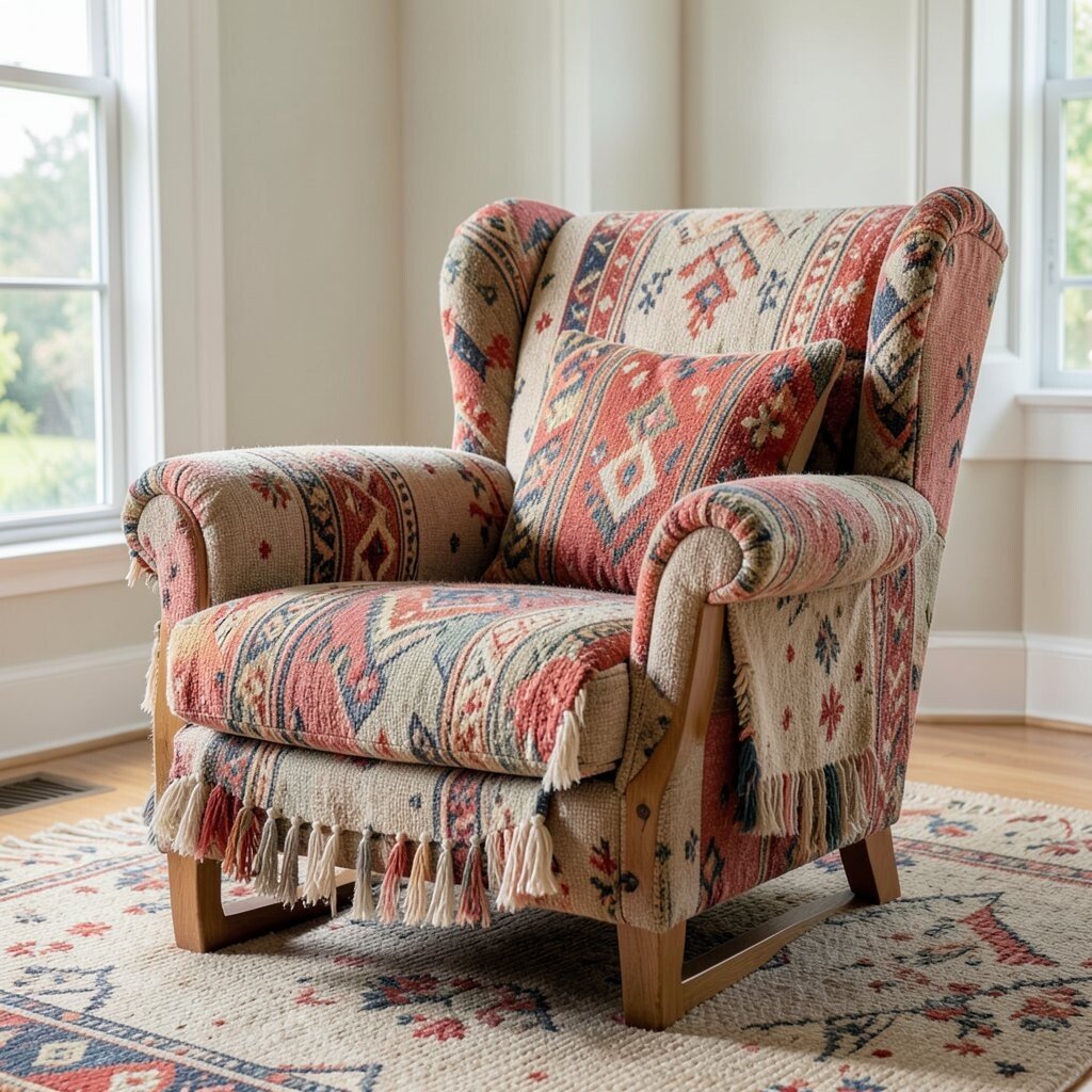 Look for chairs featuring woven materials, tassels, and bright patterns. These elements create an eclectic and inviting atmosphere.