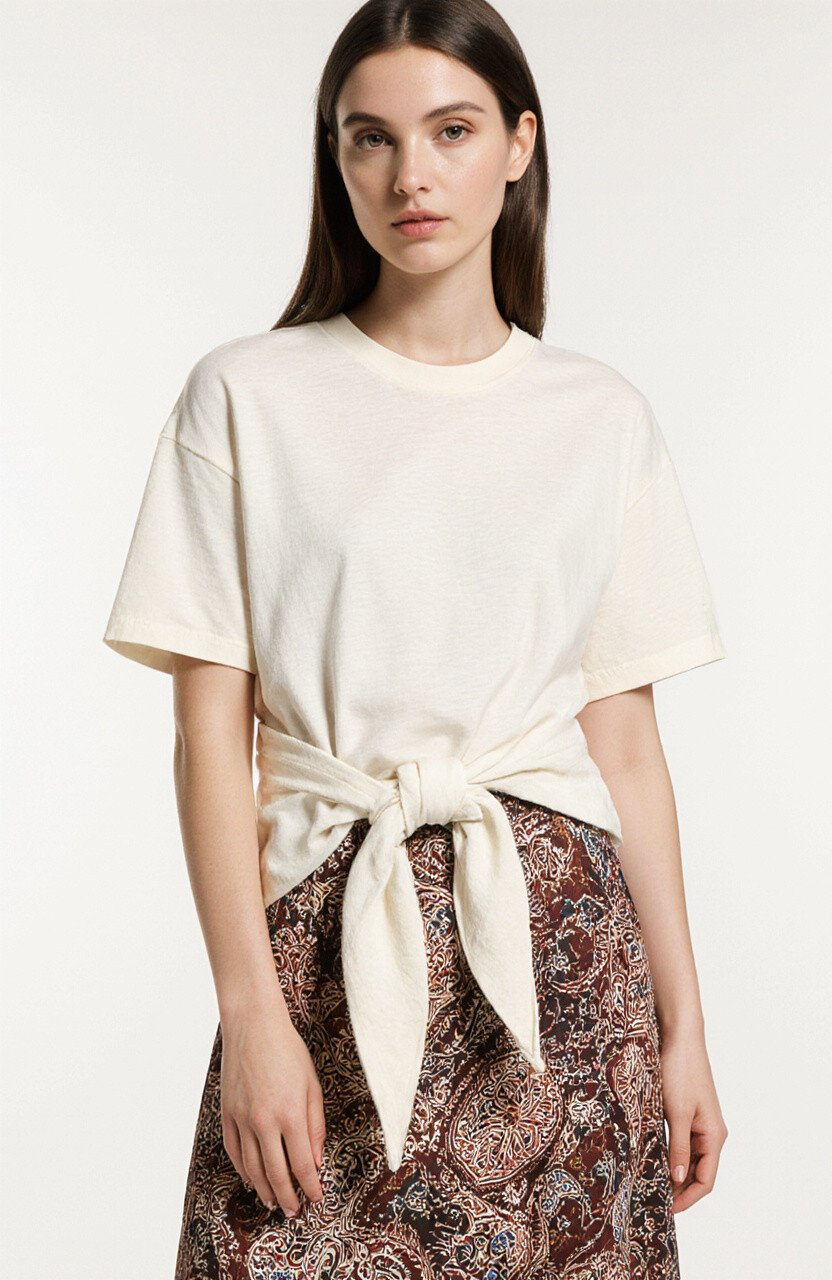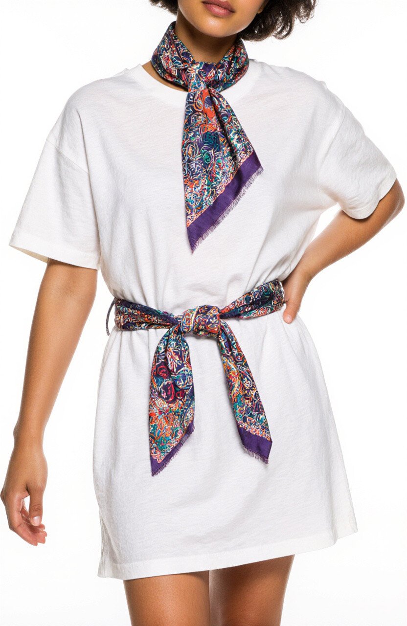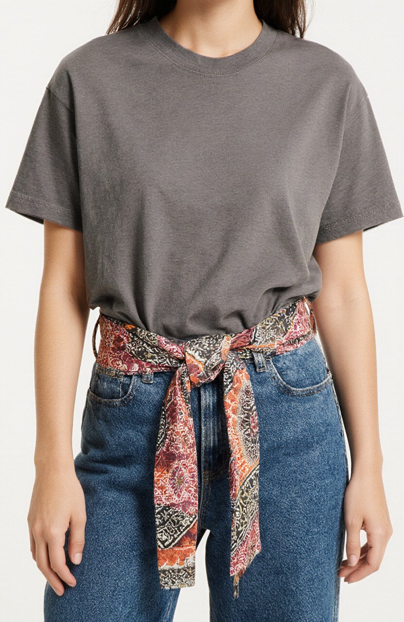 This is a cost-effective way to spice up a plain t-shirt and turn it into something special. The scarf adds texture and personality, making it a truly personal look. Perfect for hot days when you want to feel breezy and stylish.