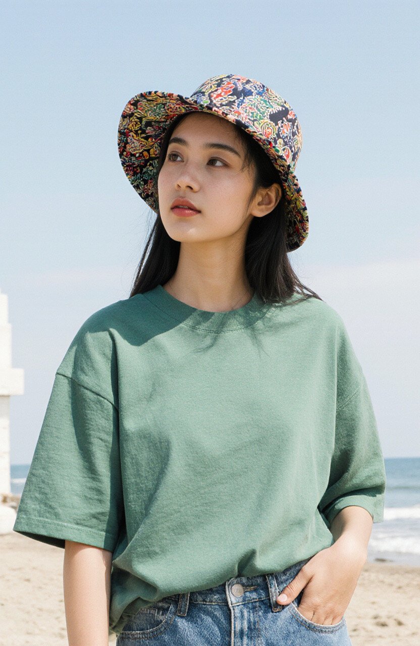 Top off your oversized t-shirt with a batik hat for a fun and quirky touch. The hat adds personality and protects you from the sun. It’s perfect for outdoor activities or festivals.