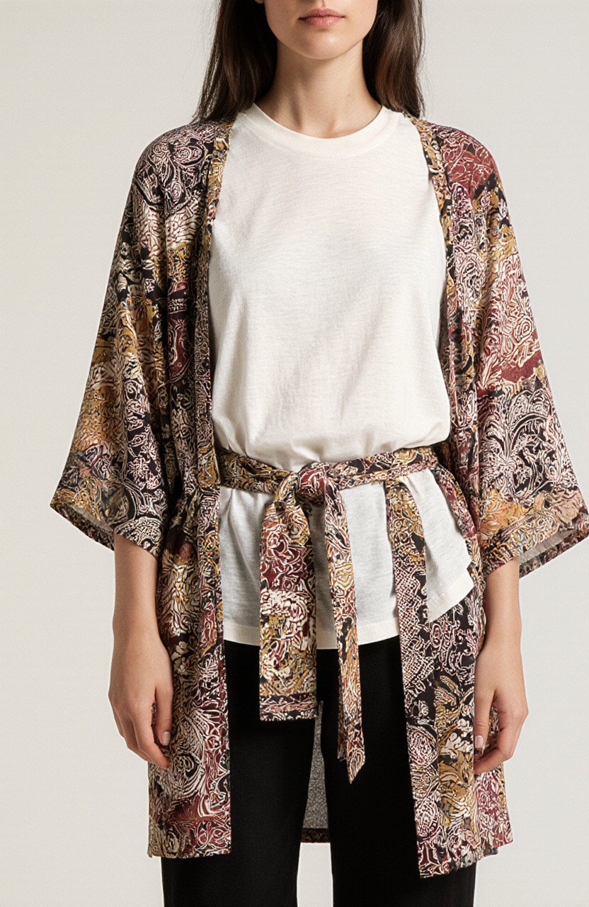 Layer an oversized t-shirt with a flowing batik kimono for a bohemian vibe. The kimono adds a touch of elegance and movement. It’s a great way to incorporate batik into your outfit with minimal effort.