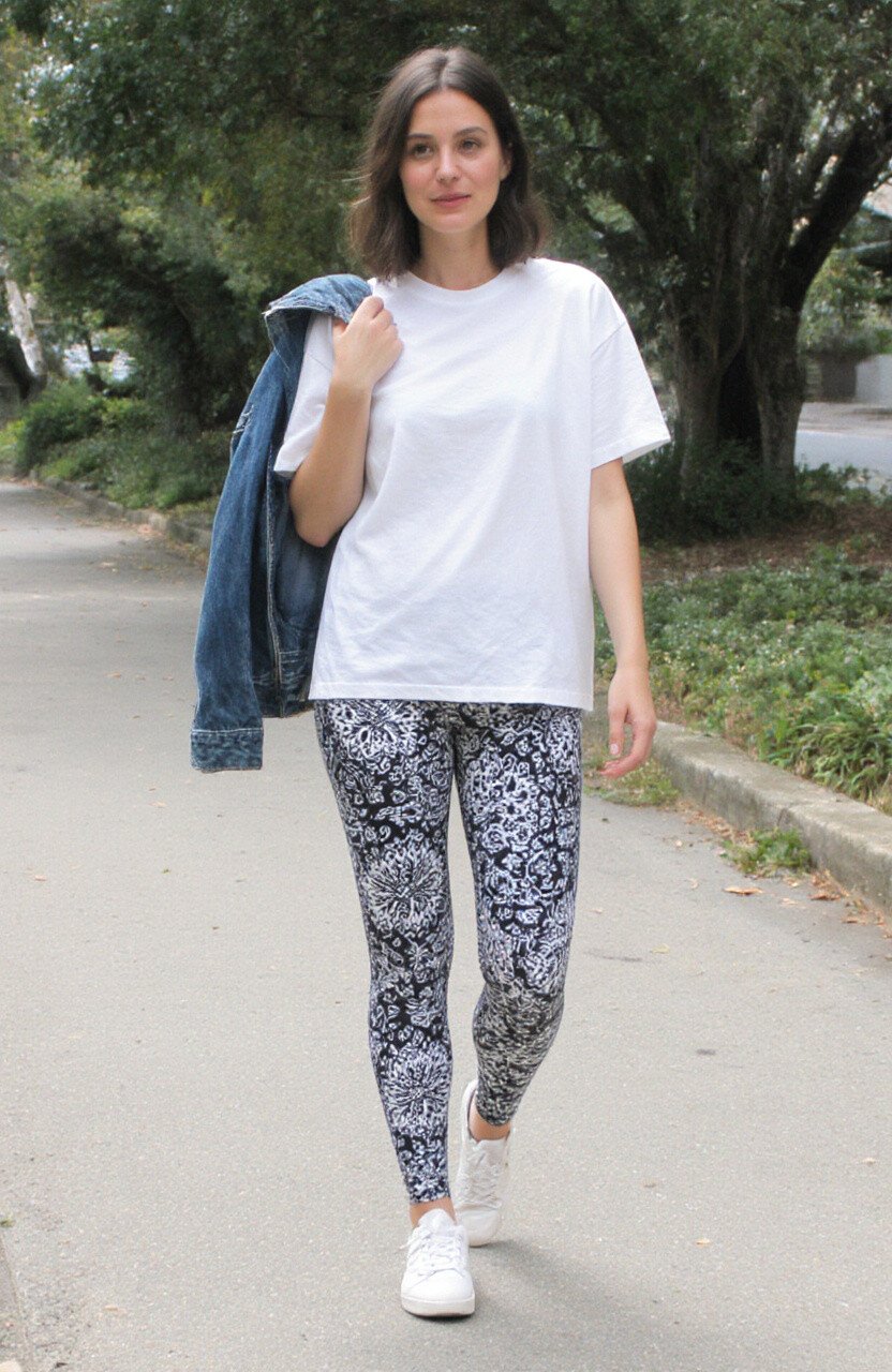 For a cozy yet stylish outfit, pair your oversized t-shirt with batik leggings. The leggings add a burst of pattern and can be quite stretchy and comfortable. This pairing is perfect for yoga, a casual day in, or a relaxed outing.
