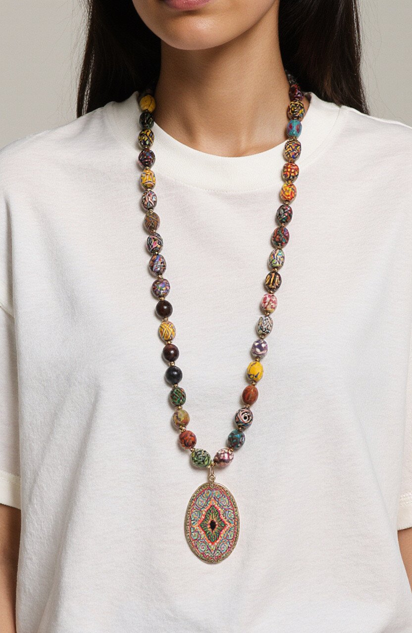 Adorn your oversized t-shirt with a batik necklace for a touch of elegance. The necklace adds a focal point and elevates your look. It’s ideal for when you want to dress up a casual outfit.