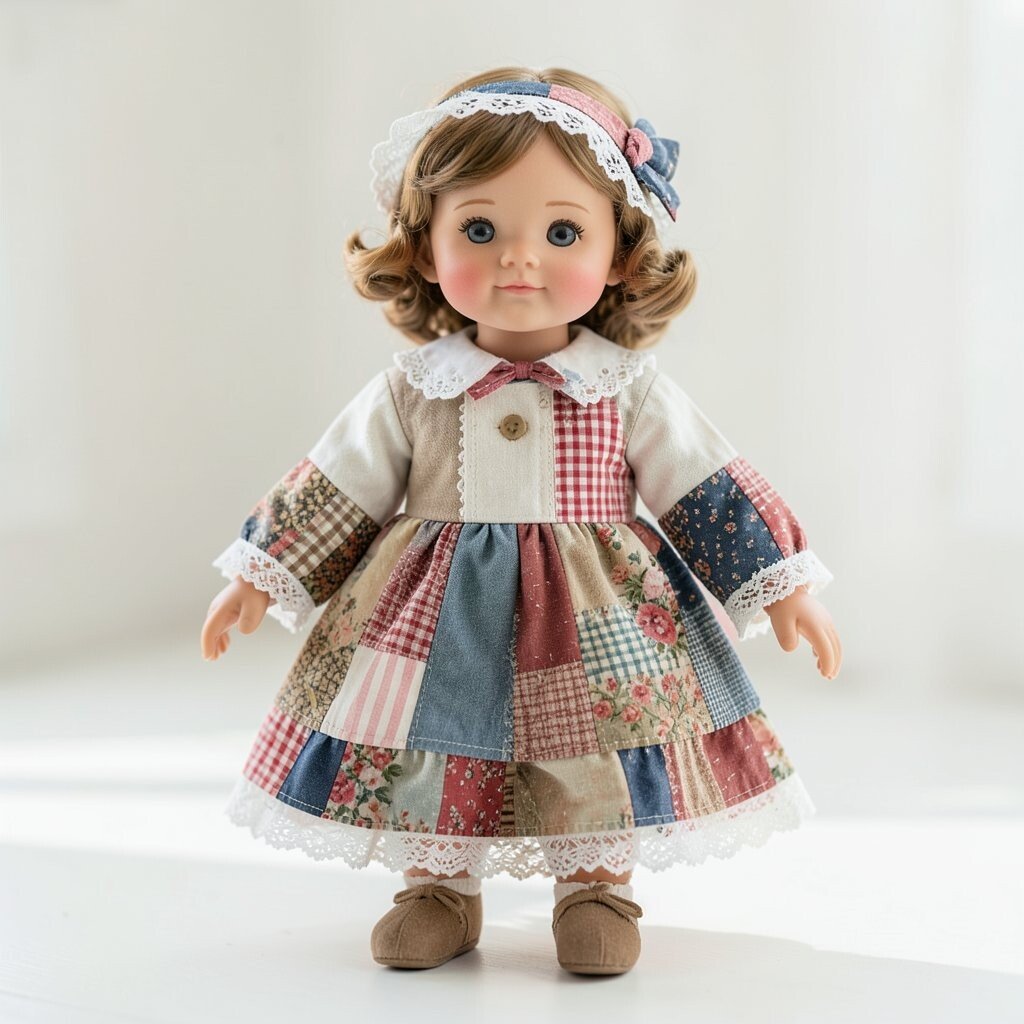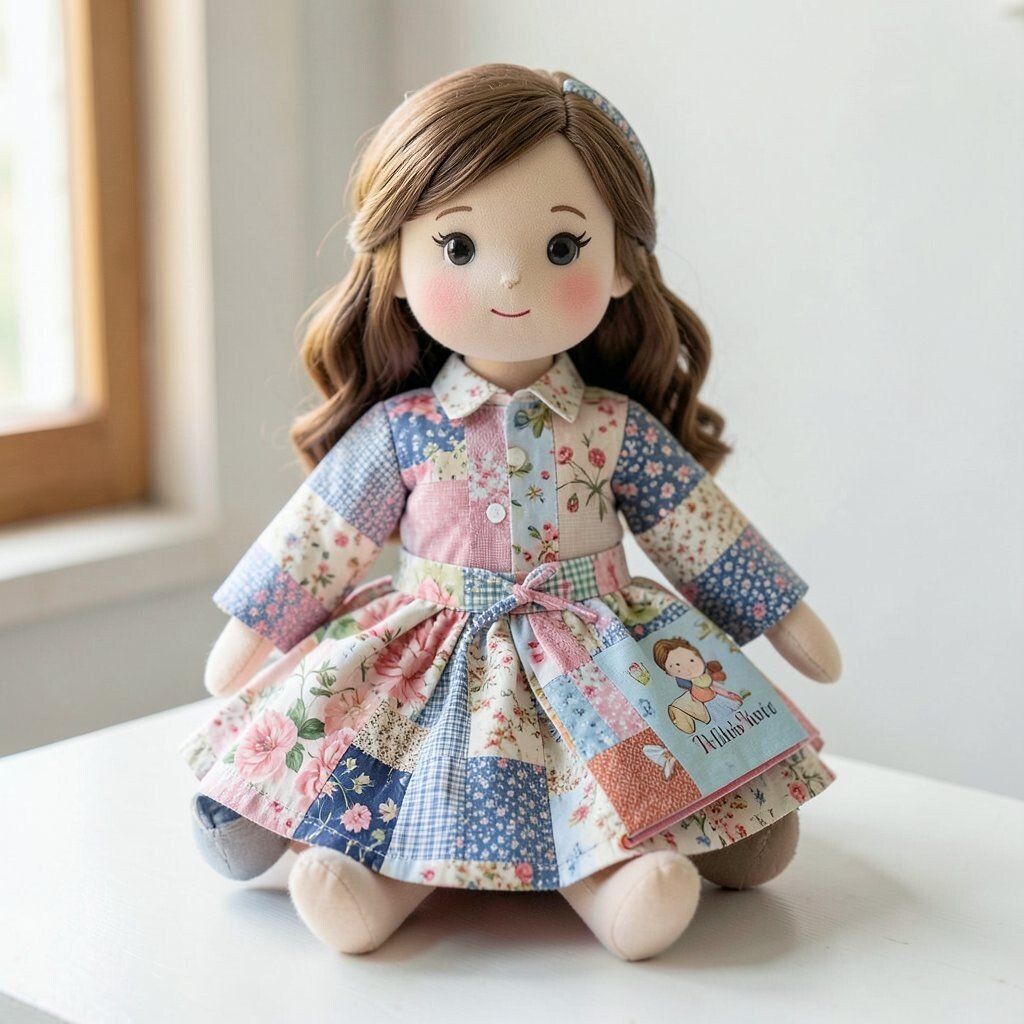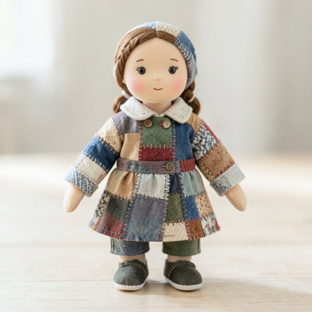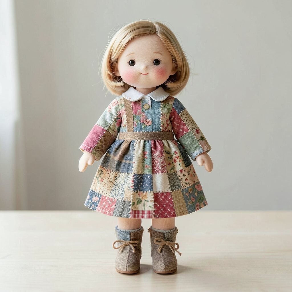 A storybook doll often has a dress made of tiny fabric squares that look like pages from a dreamy tale. Soft blues, creams, and faded reds can make it feel old-fashioned in the best way.
