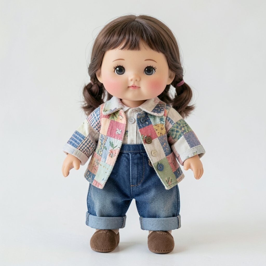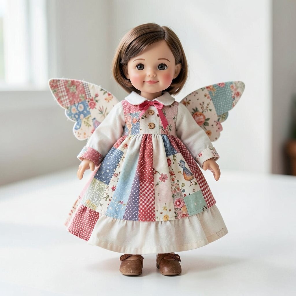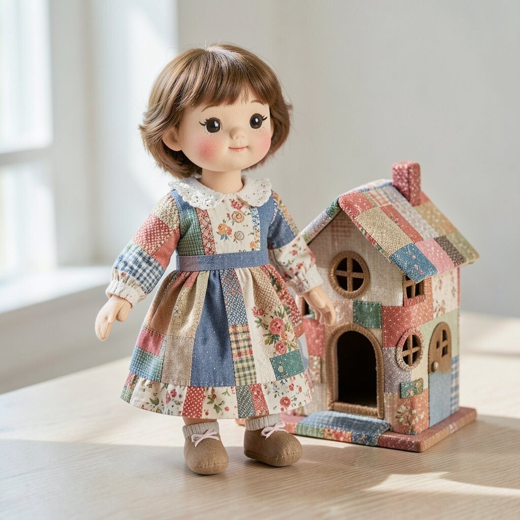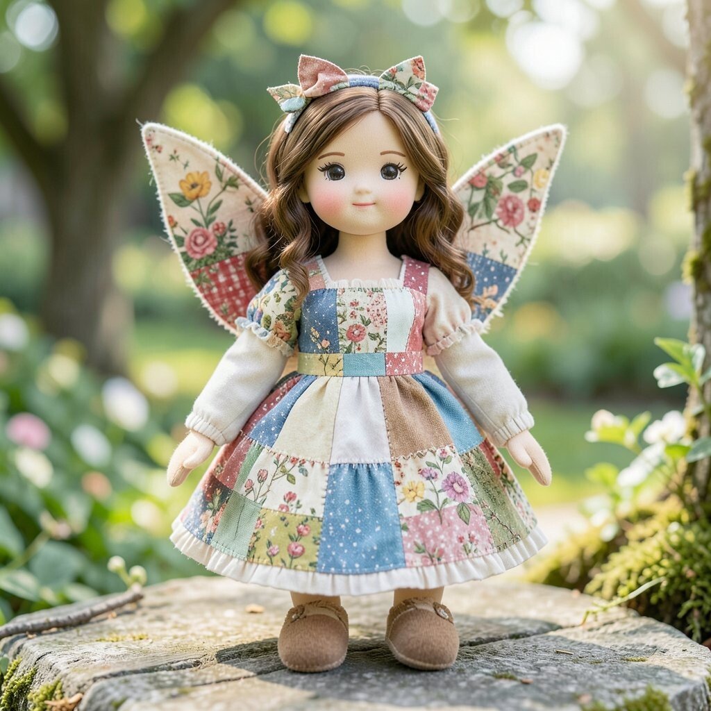 A storybook doll often has a dress made of tiny fabric squares that look like pages from a dreamy tale. Soft blues, creams, and faded reds can make it feel old-fashioned in the best way.