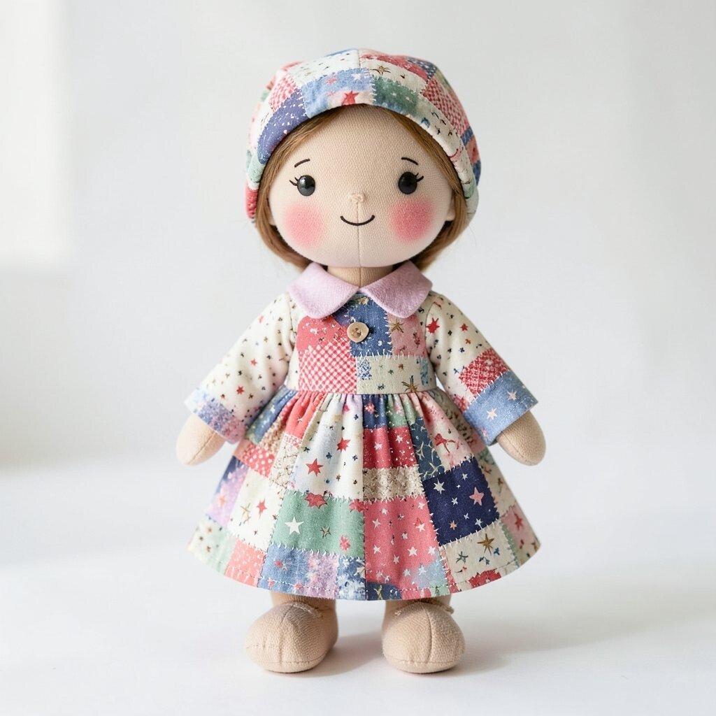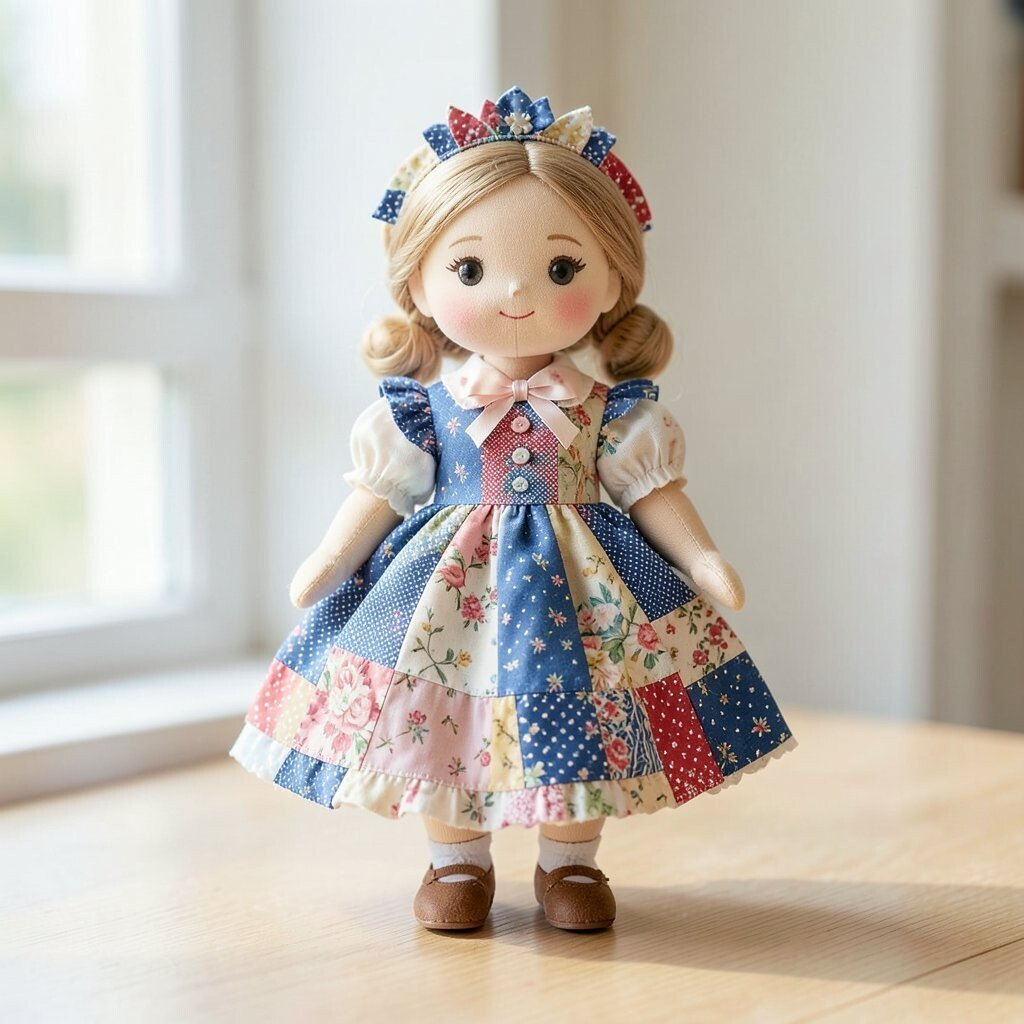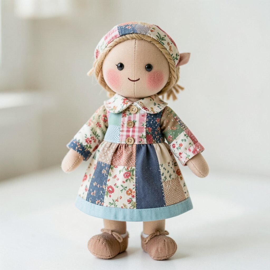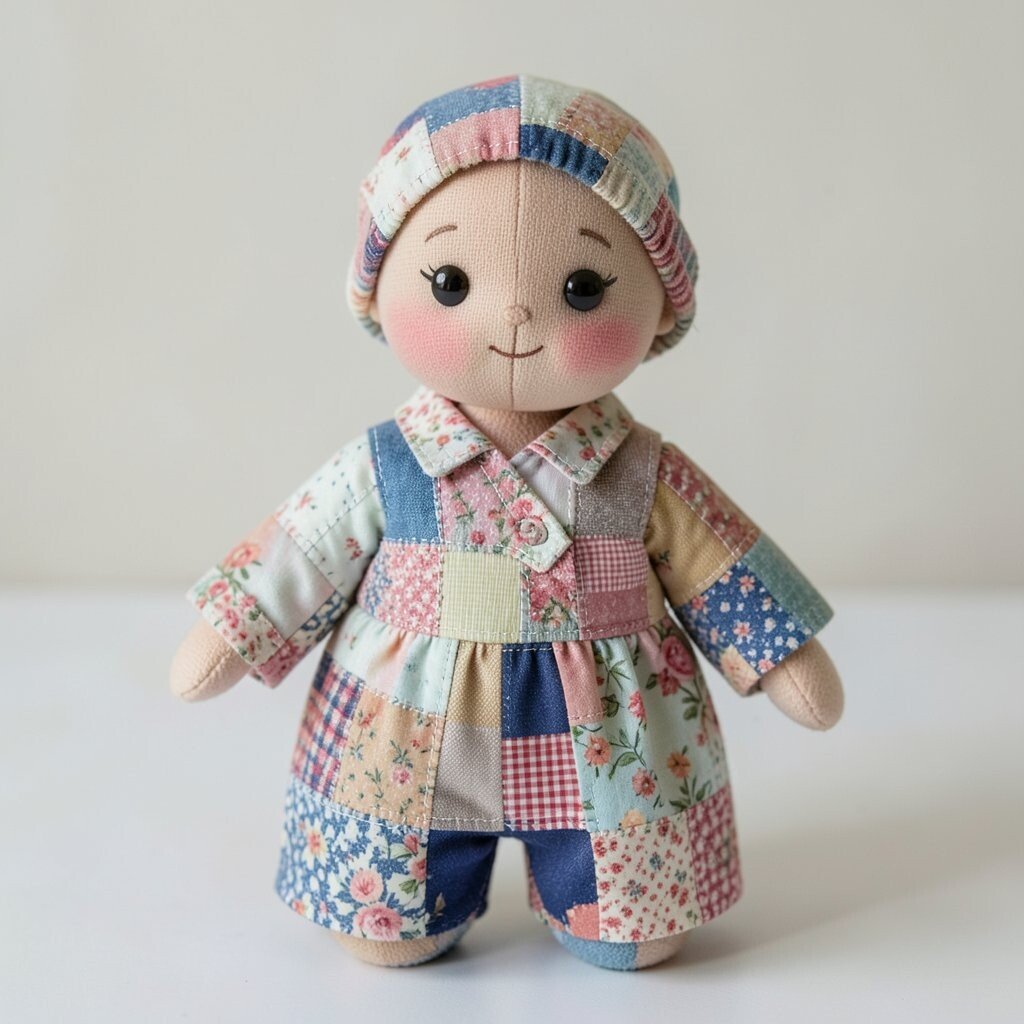 A patchwork doll with a friendship quilt style uses many different scraps that feel warm and shared. Each piece can come from a loved one’s old clothing, a saved fabric stash, or a special project memory.