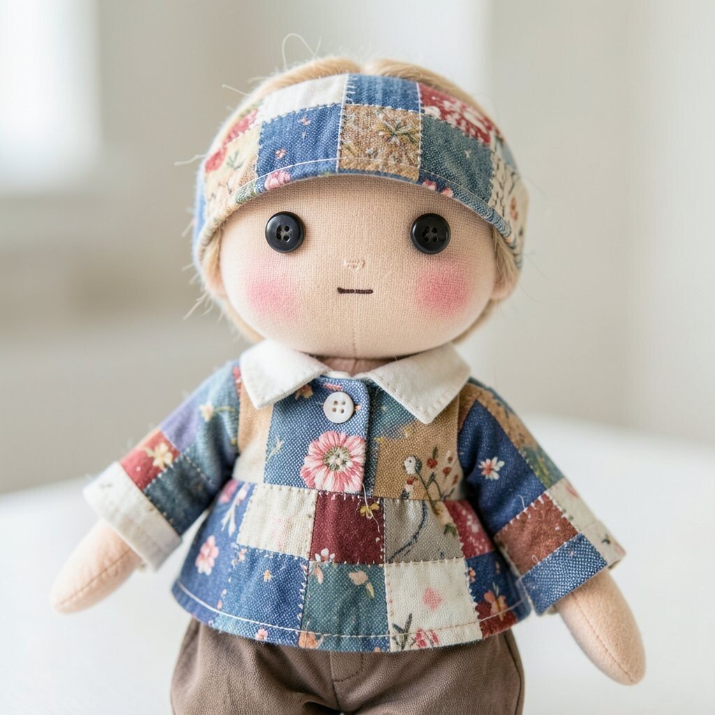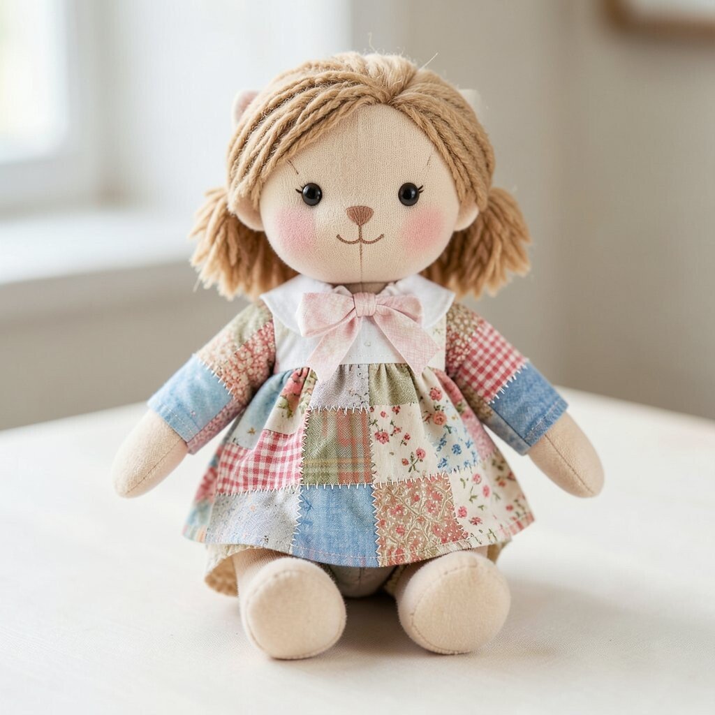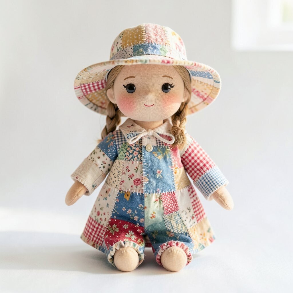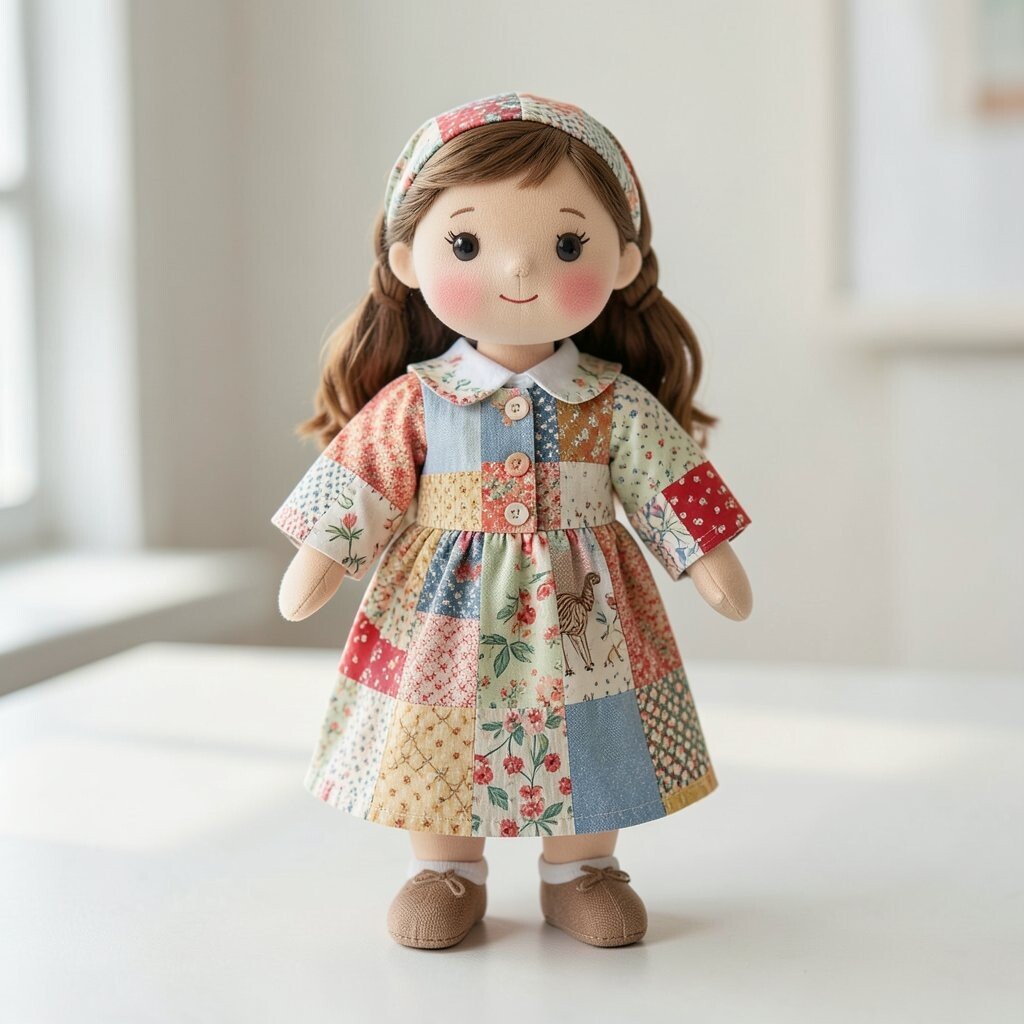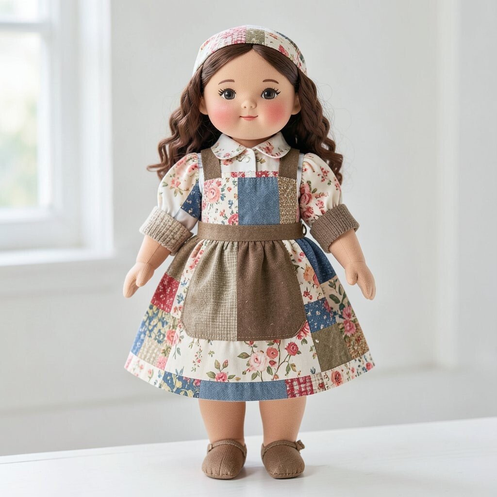 A patchwork doll with a friendship quilt style uses many different scraps that feel warm and shared. Each piece can come from a loved one’s old clothing, a saved fabric stash, or a special project memory.