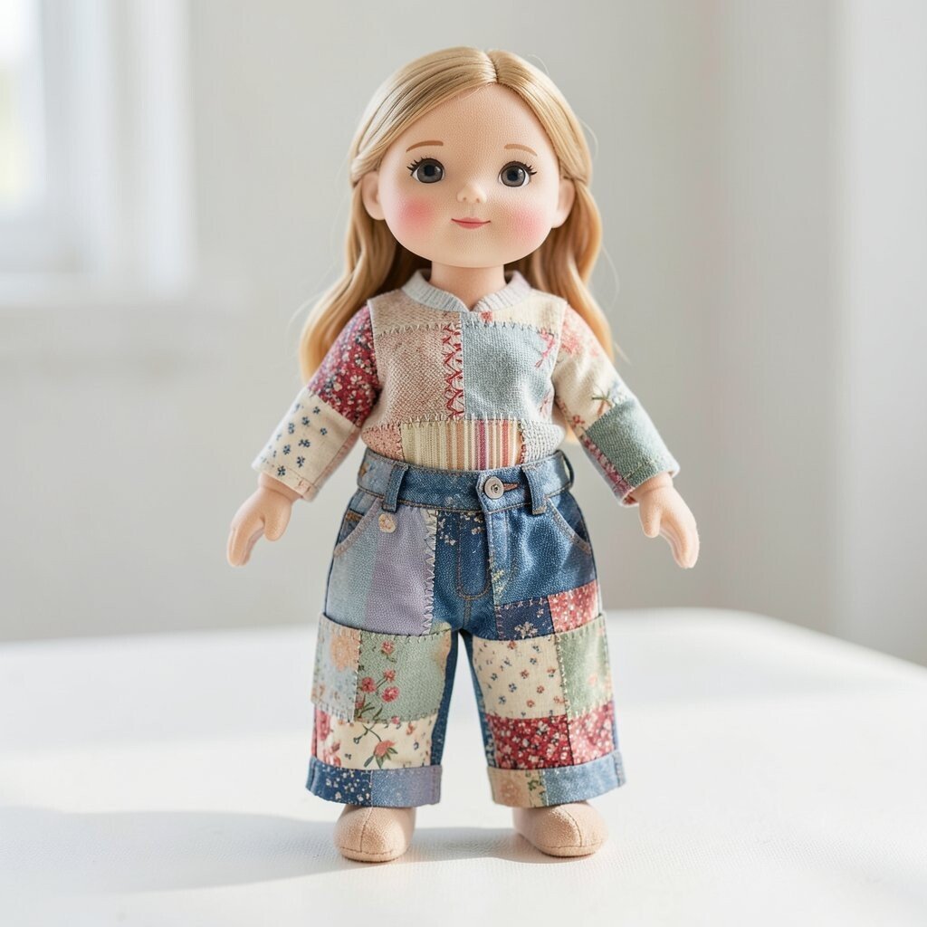 A patchwork doll with patch pants has a playful, slightly rustic look that feels full of character. The pants can be made from denim bits, plaid squares, or mismatched cloth for a fun patchy style.