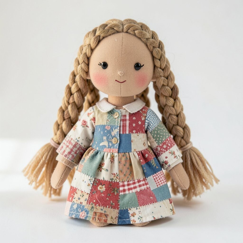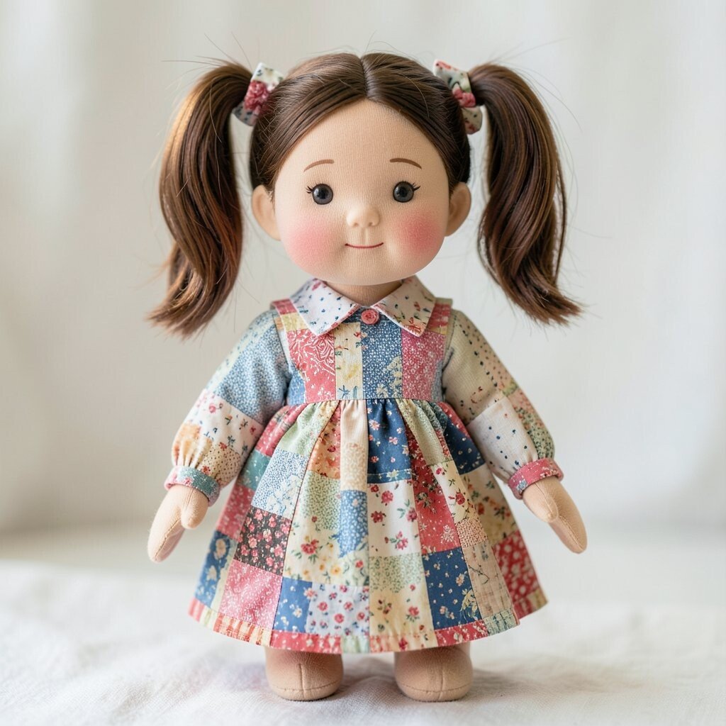 A patchwork doll with pigtails has a lively, youthful look that many children adore. The pigtails can be made from yarn, fleece strips, or braided fabric for a soft and bouncy feel.