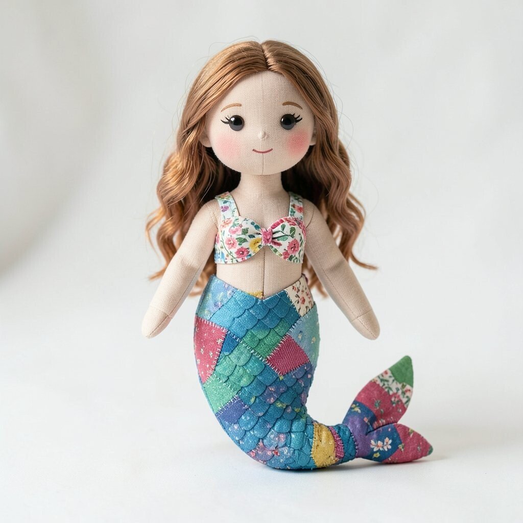 A patchwork mermaid doll shines with a tail made from shiny scraps, scale prints, or glittery fabric. Long hair in yarn or ribbon gives it a dreamy ocean look.