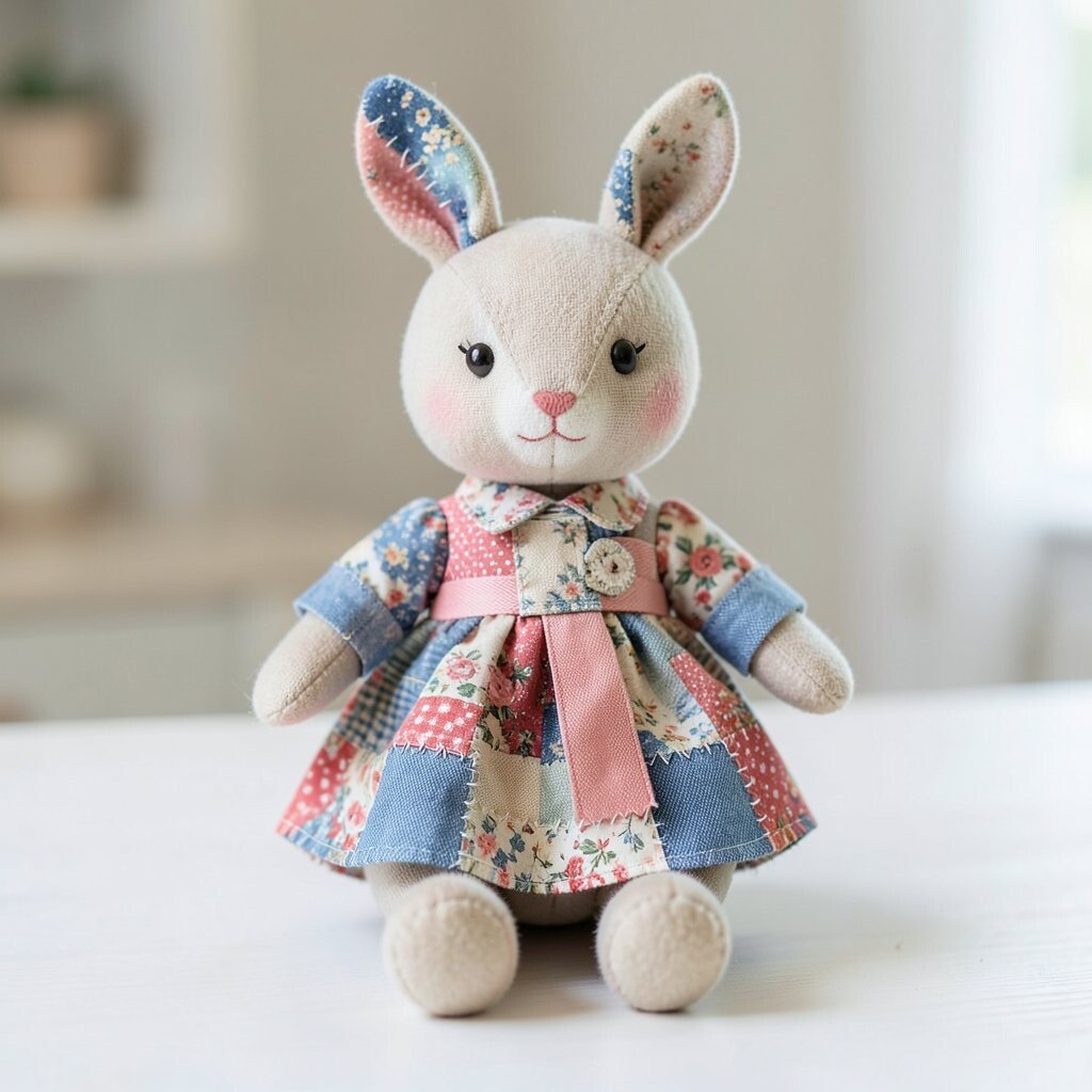 A patchwork bunny doll looks cute with long floppy ears and a round little belly. Soft pastel pieces make it feel gentle, while tiny stitched whiskers or a nose give it a playful look.
