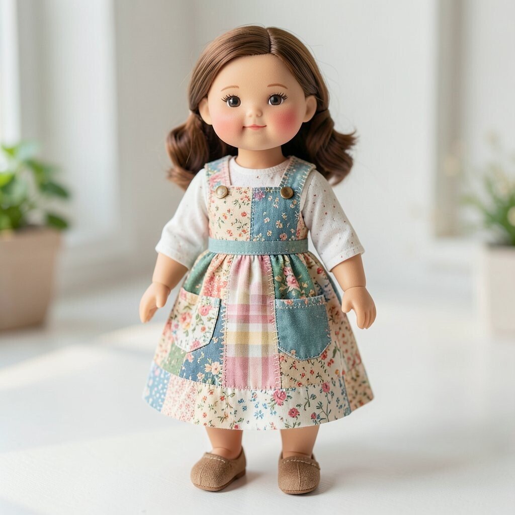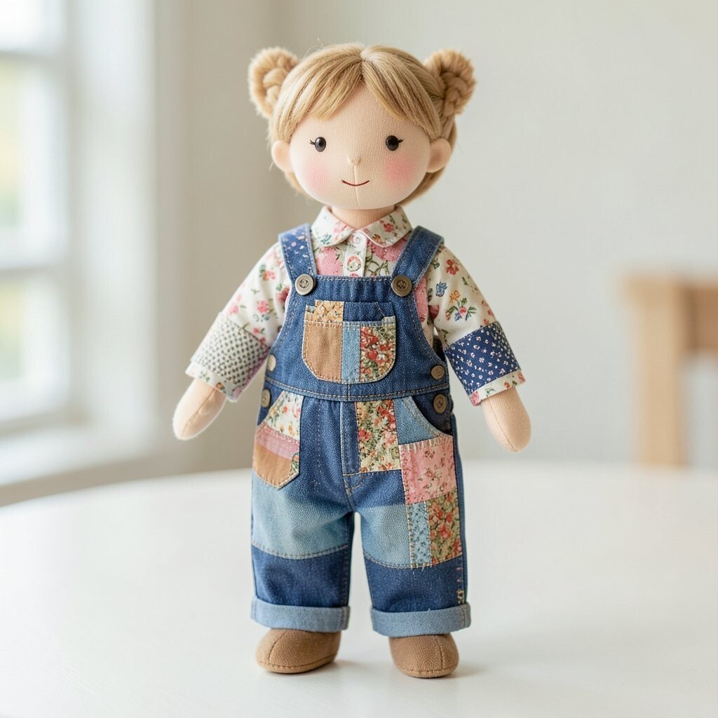 Overalls are a current favorite in handmade toy design because they feel cute and simple. They also give you a good place to show off patchwork pieces without making the doll too busy.