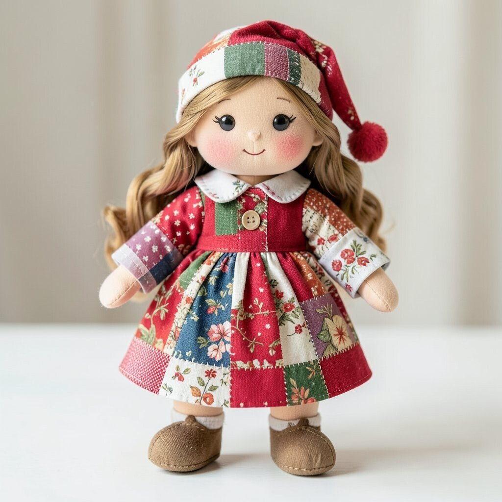 A patchwork holiday doll can wear colors that match a season, like red and green for winter or orange and brown for fall. The face stays simple, but the outfit makes the doll feel festive and bright.