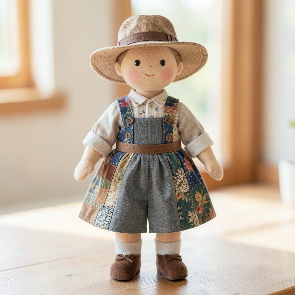 A patchwork farmer doll can wear overalls, a checked shirt, and a sturdy little hat. Earthy fabrics like denim, tan, and red plaid make the doll feel friendly and down to earth.