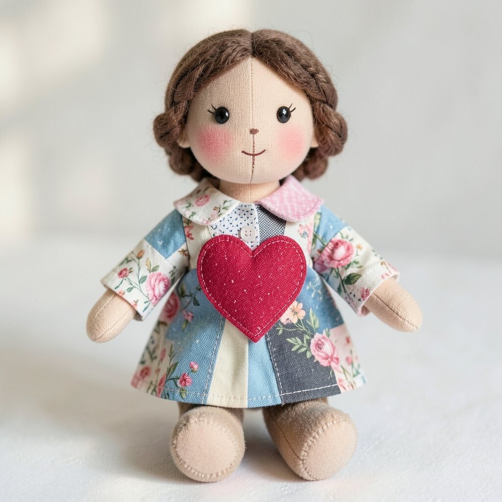 A patchwork doll with a heart patch has a sweet, loving feel that makes it easy to gift. The heart can be stitched on the chest, dress, or even the cheek for a playful touch.