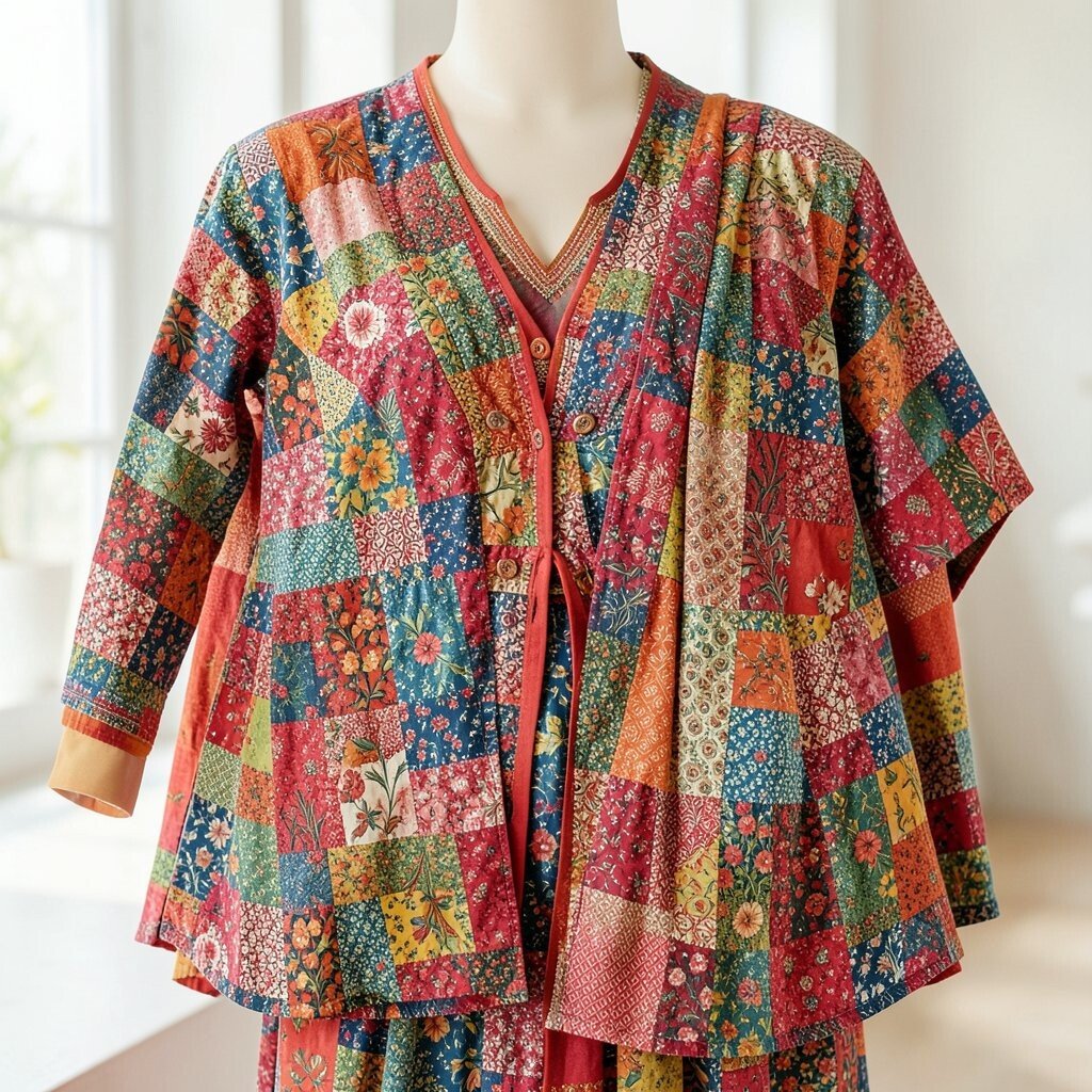 Patchwork jackets can make even a plain outfit feel bold and fun. With Indian fabrics, the look can blend folk charm, city style, and a little bit of art.