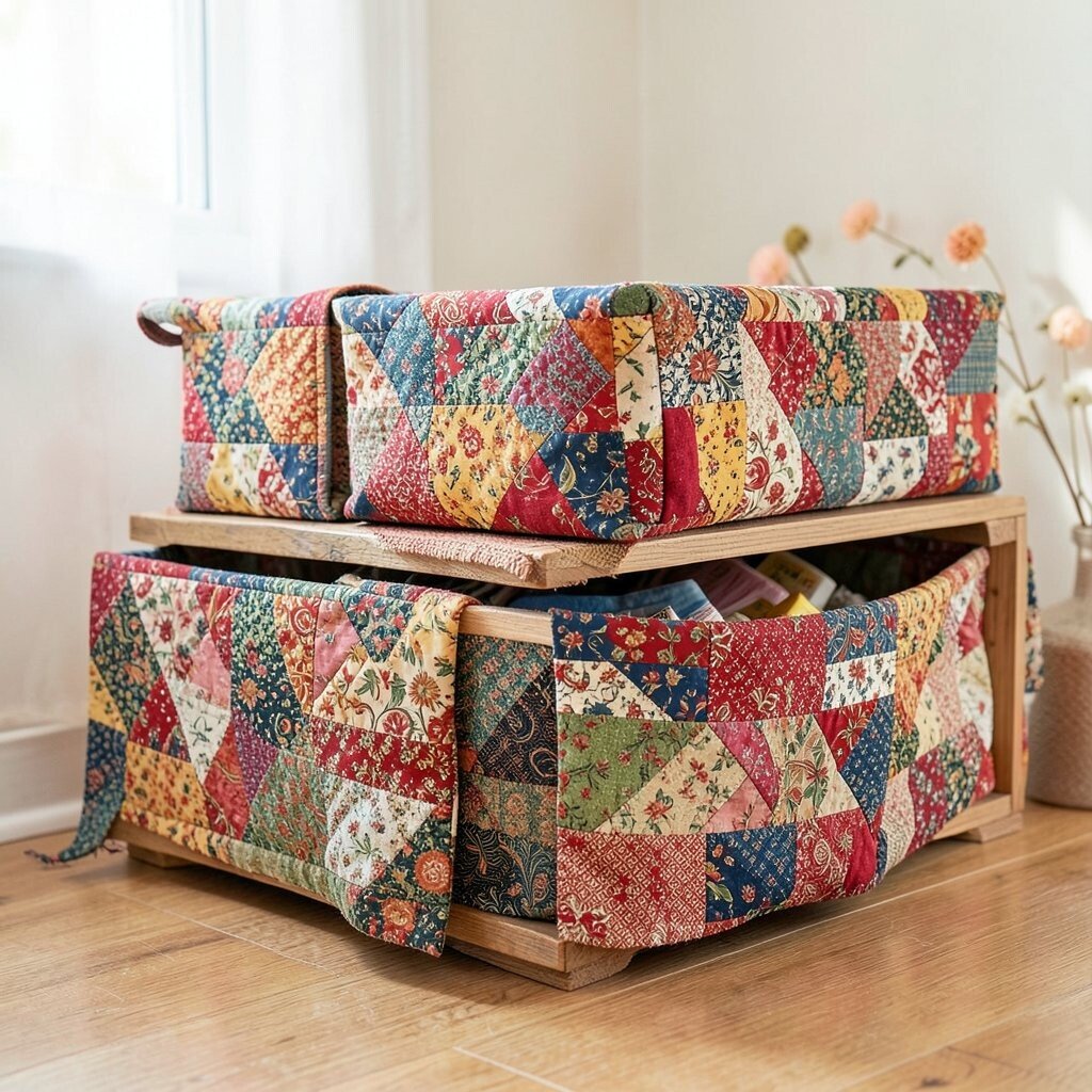 Patchwork storage baskets can help tidy shelves while adding color. Indian fabrics wrapped around firm basket shapes can make storage feel friendly instead of dull.