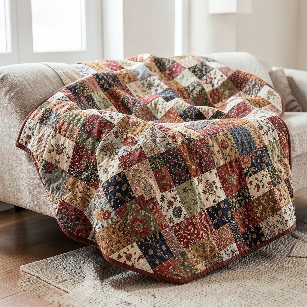 A patchwork quilt throw can make a couch or bed feel extra cozy. Indian fabric prints stitched together create a layered look that feels warm and full of memory.
