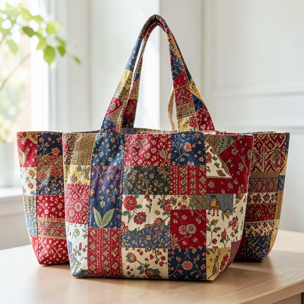 A patchwork tote bag adds color to errands, school days, and market trips. The mix of fabrics gives each bag a one-of-a-kind feel that stands out in a crowd.