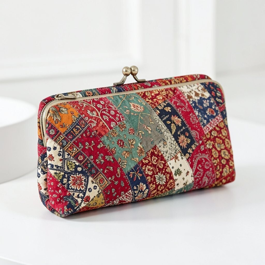 A patchwork clutch can be a tiny piece of art you carry in your hand. Indian textile scraps in silk, mirror work, or printed cotton can make it look bright and special.
