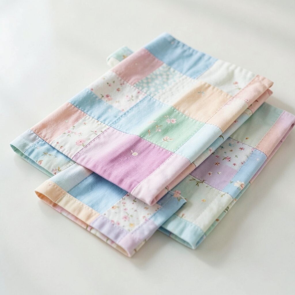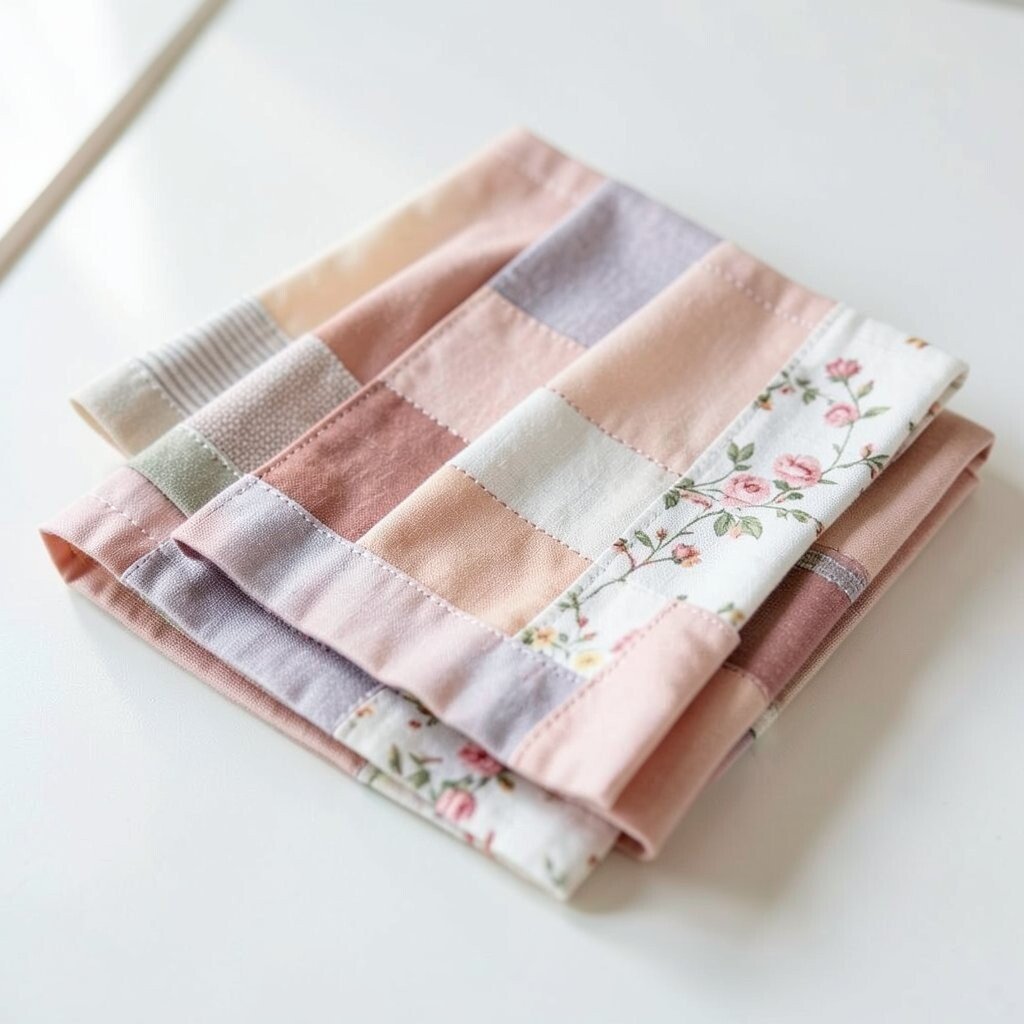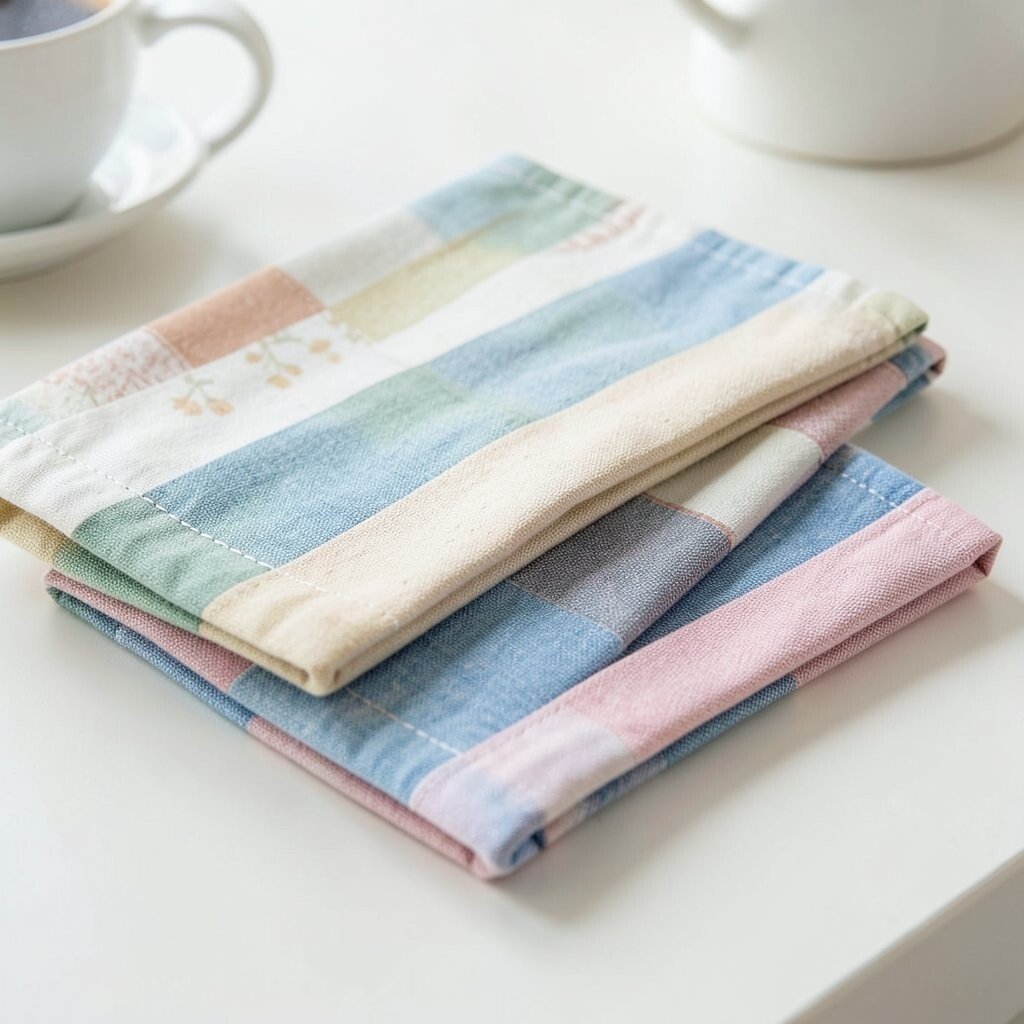 Soft pastel patch napkins bring a calm and sweet look to the table. Their gentle shades can make even a plain meal feel special and neat.