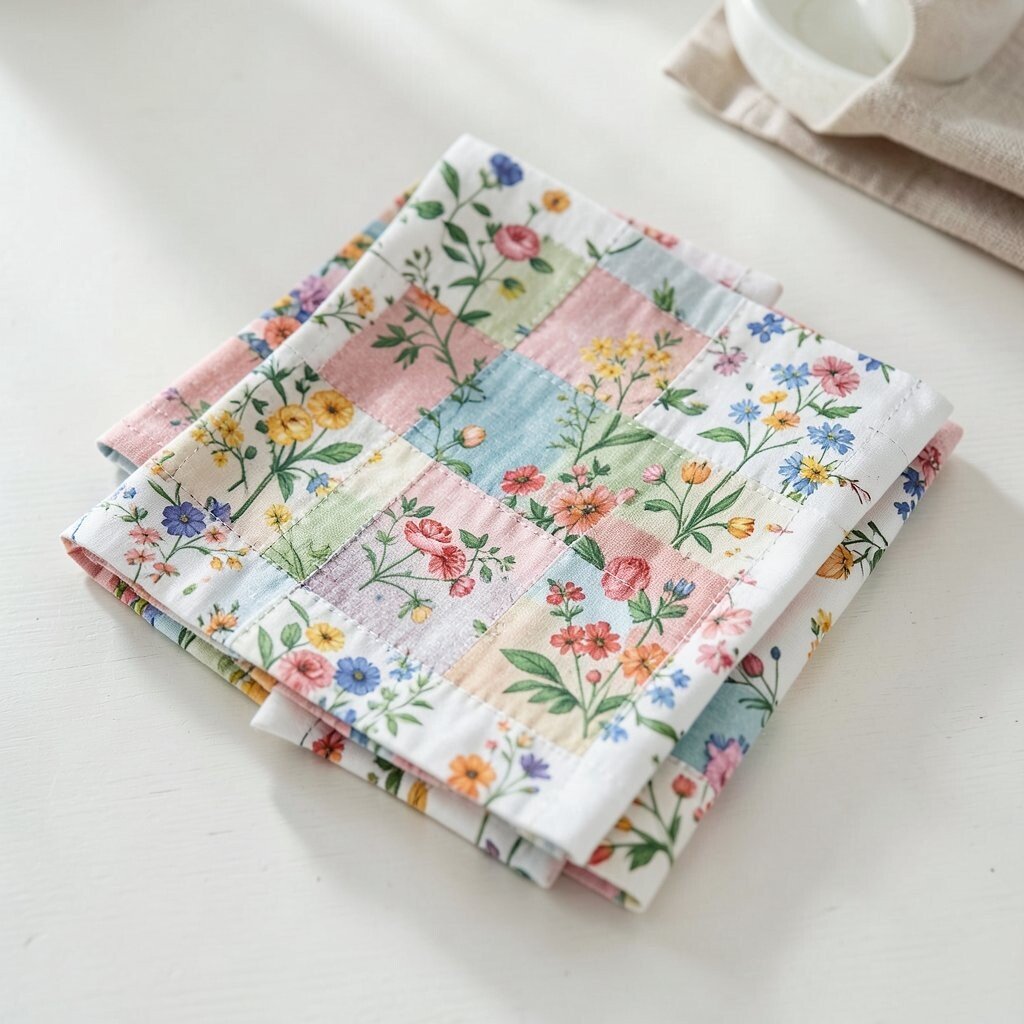 Floral cottage patch napkins feel sweet, soft, and a little dreamy. Tiny flowers mixed with checks or dots can make the table look like a storybook scene.