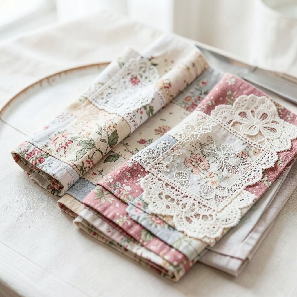 Vintage lace patch napkins have a soft, old-time beauty. Lace mixed with cotton patches can make a table feel delicate and special right away.