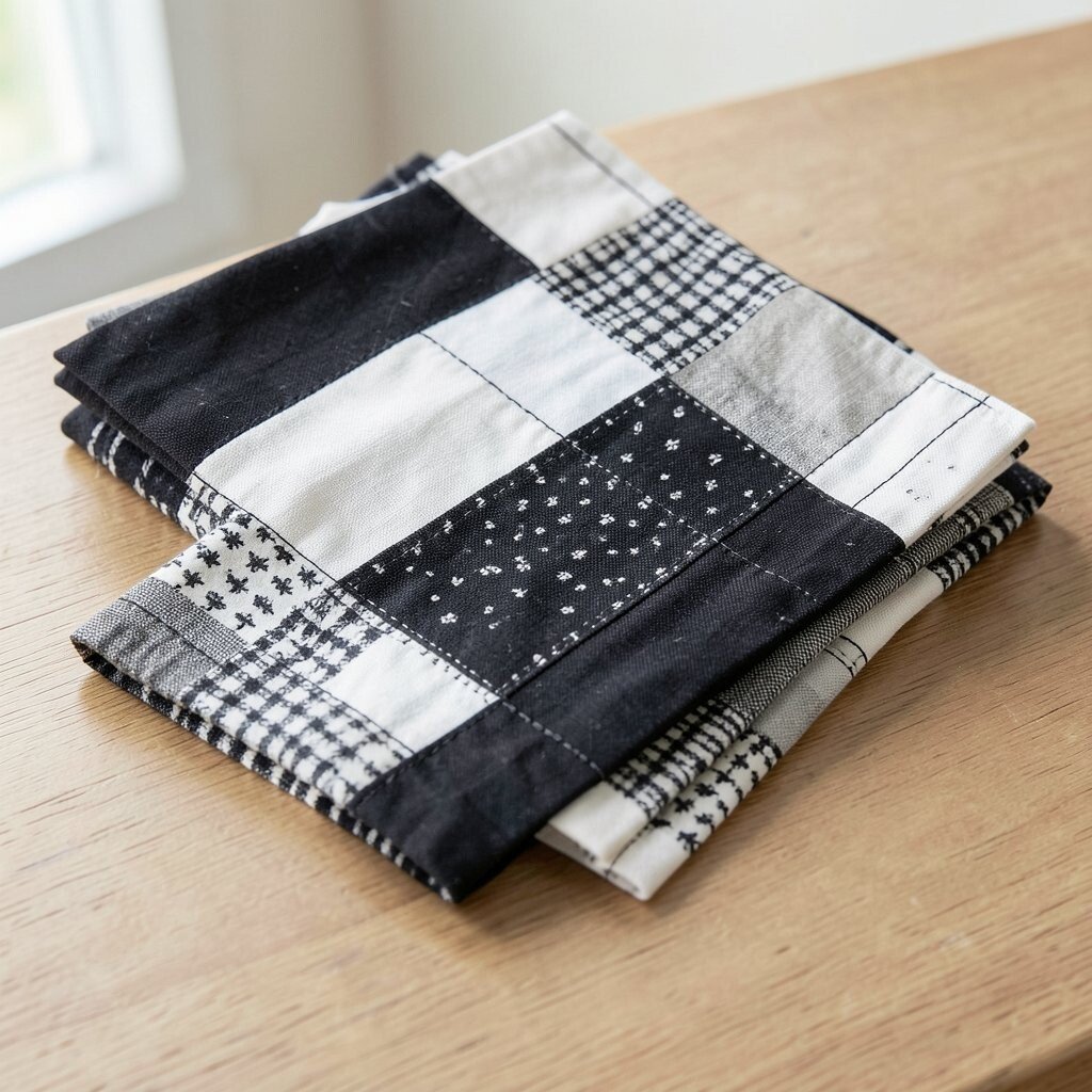 Black and white patch napkins have a strong, stylish look. The high contrast makes the patchwork shapes stand out in a very clean way.