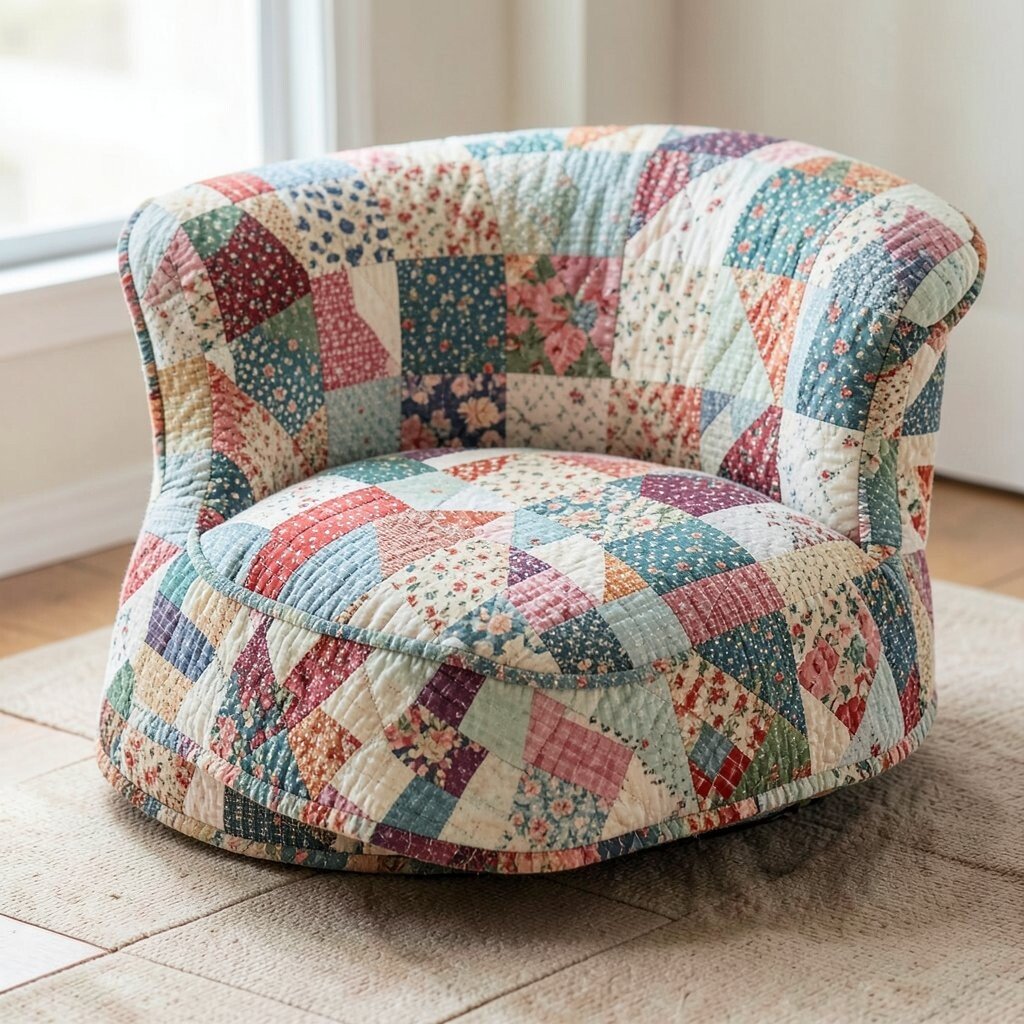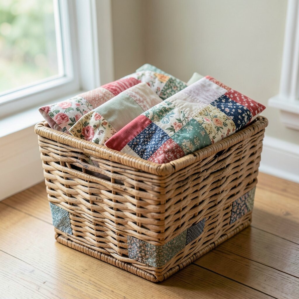 A patchwork storage basket brings color right into the room. Soft squares, mixed prints, and neat stitching make it look cheerful and useful at the same time.