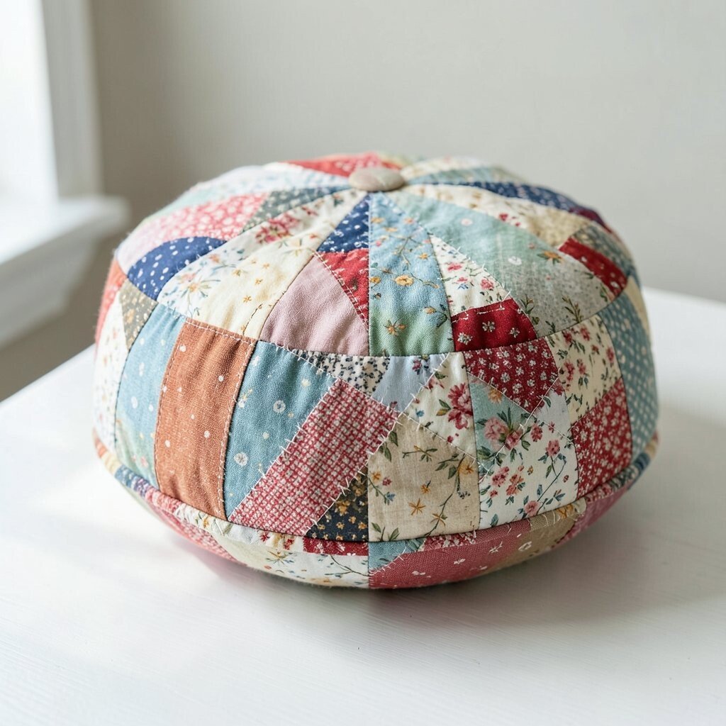 A patchwork pin cushion is small, sweet, and very helpful. It keeps pins and needles easy to reach while adding color to a sewing table.