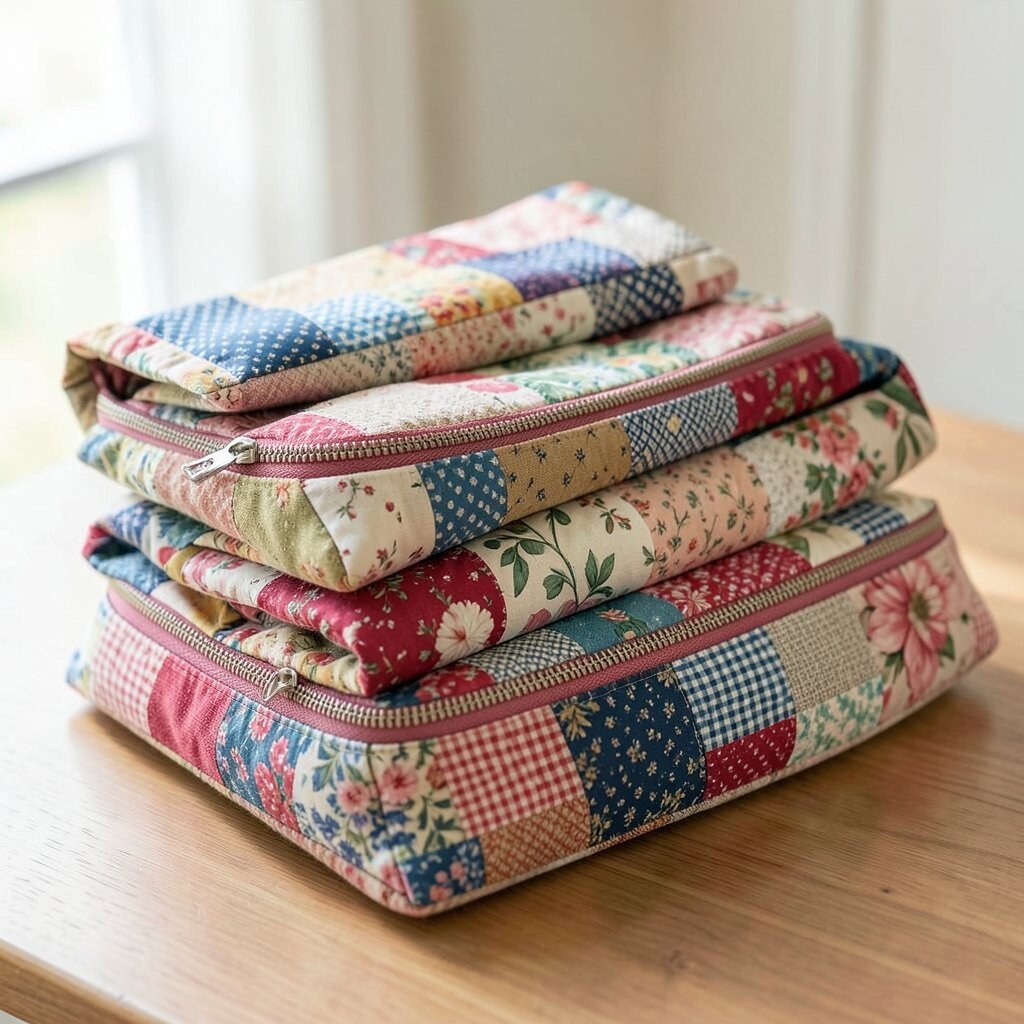 Patchwork zipper pouches are small, stylish, and very useful. They can hold makeup, sewing tools, pencils, or travel bits.