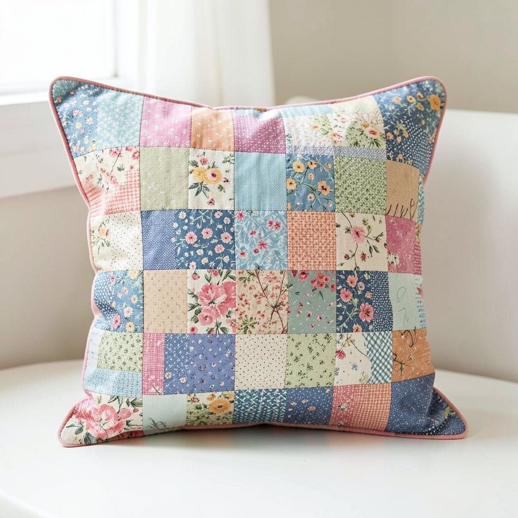 Patchwork pillow covers can change a room fast. A mix of soft cottons, checks, florals, and solids gives a sofa or bed a friendly, lived-in look.