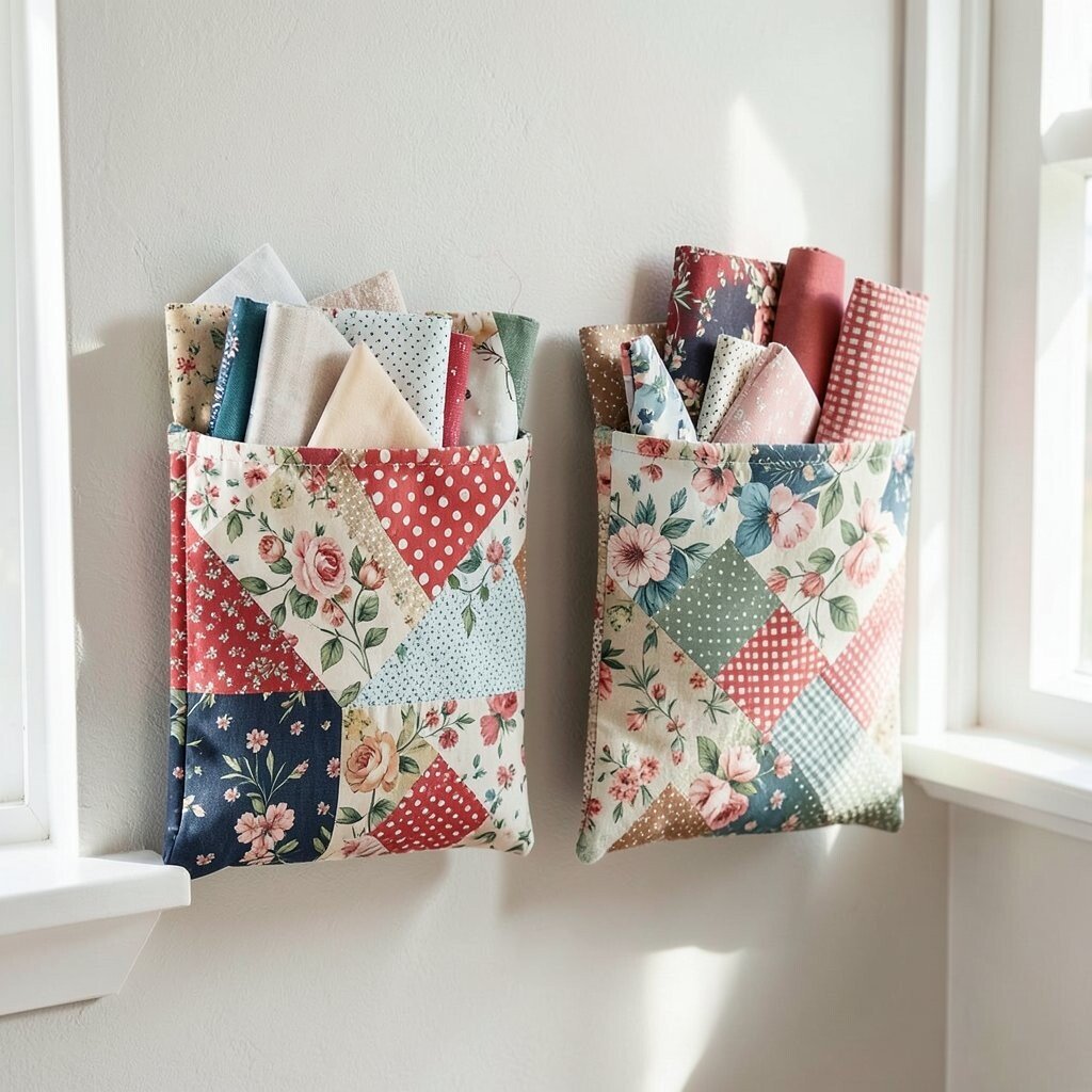 Fabric scrap wall pockets offer storage with style. They can hold mail, notes, craft tools, or small plants in a neat hanging display.