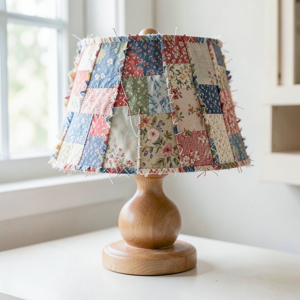A fabric scrap lampshade can give a room a soft glow. The patchwork surface looks artistic when the light shines through it.