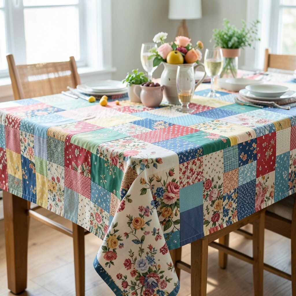 Patchwork tablecloths set a joyful tone for meals, celebrations, or everyday dining. Combining with solid placemats can enhance the table setting.