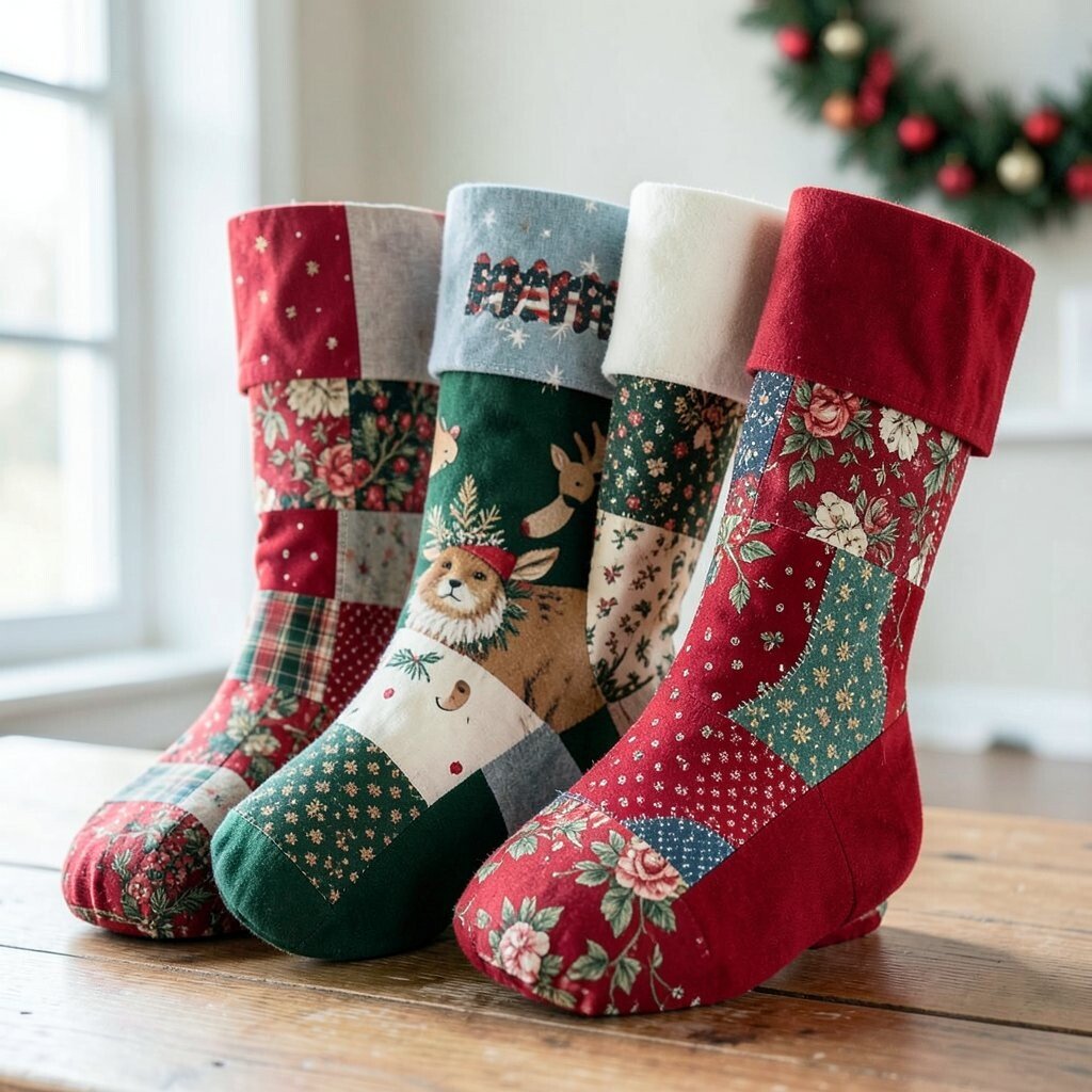 Christmas stockings in patchwork are festive and fun. The patchwork design is merry, and a solid cuff adds a finishing touch.