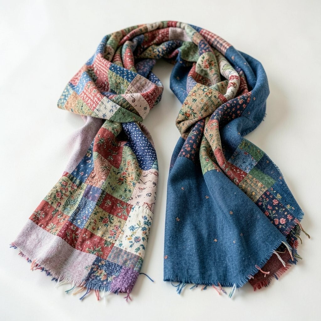 Patchwork scarves are like hugs you can wear. They bring color and comfort, perfect for chilly days. Pairing with a solid backing can highlight the patchwork design.