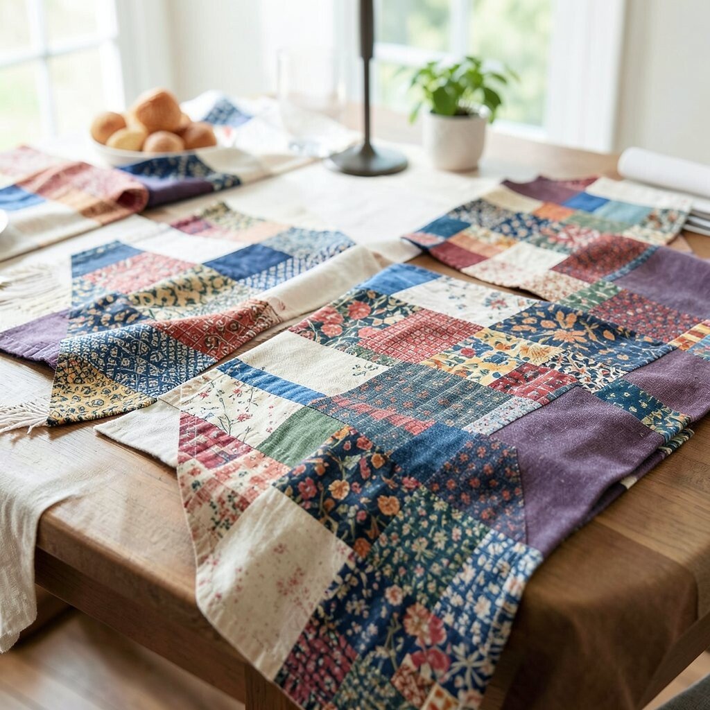 Table runners crafted from patchwork are perfect for adding flair to your dining area. Pair with solid-colored napkins for a balanced look. It’s like dressing up your table for a special occasion every day.