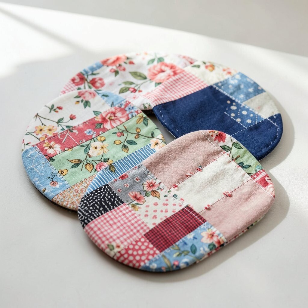 Patchwork coasters are small yet impactful. The patchwork design is delightful, and a solid base offers stability.