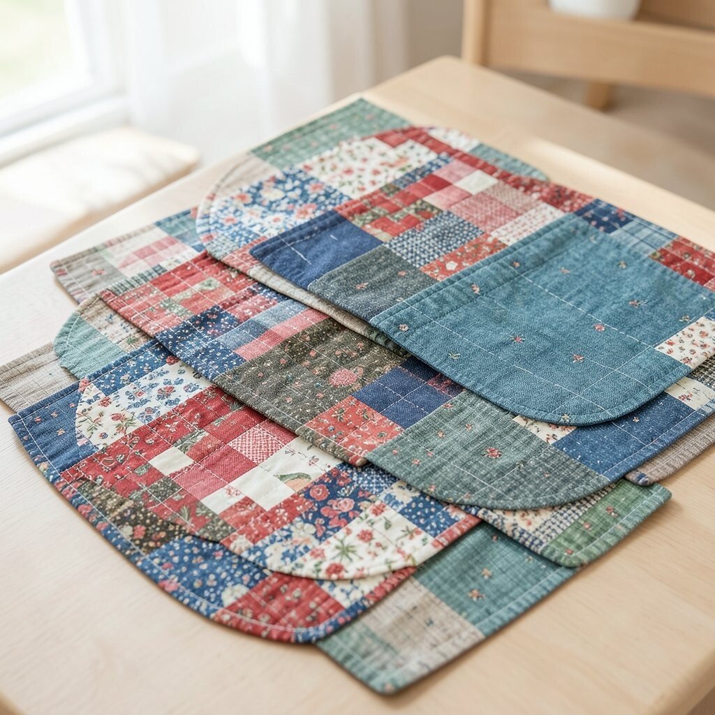 Placemats crafted from patchwork add a festive touch to meals. The combination of patchwork and solid borders makes them versatile.