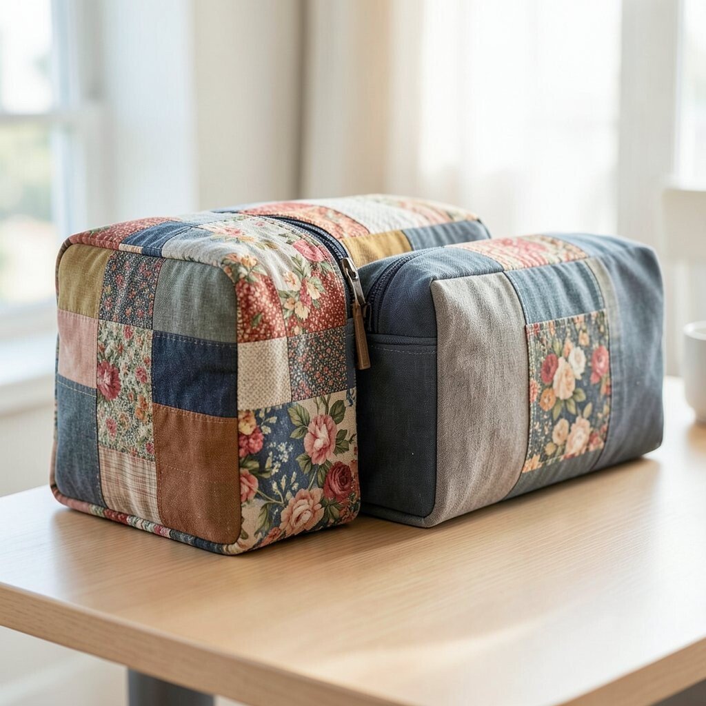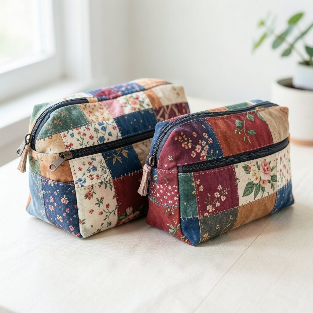 Makeup bags in patchwork are both practical and pretty. The patchwork design stands out, and a solid lining keeps things organized.