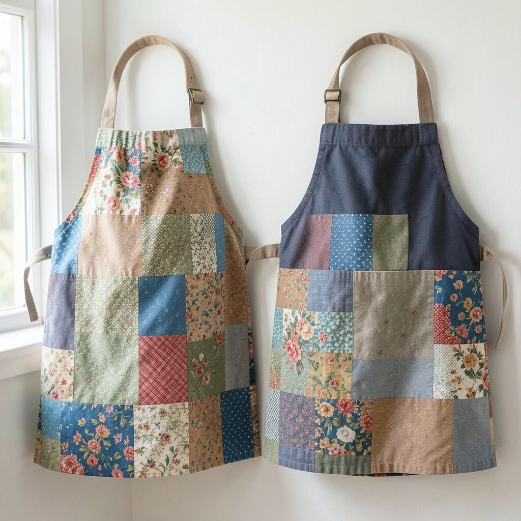 Patchwork aprons are both functional and fun. The patchwork adds a splash of personality, while a solid trim provides structure and durability.