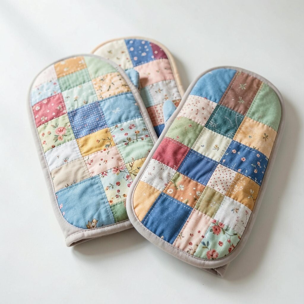 Oven mitts in patchwork are both functional and fun. The patchwork design is lively, and a solid lining offers heat protection.