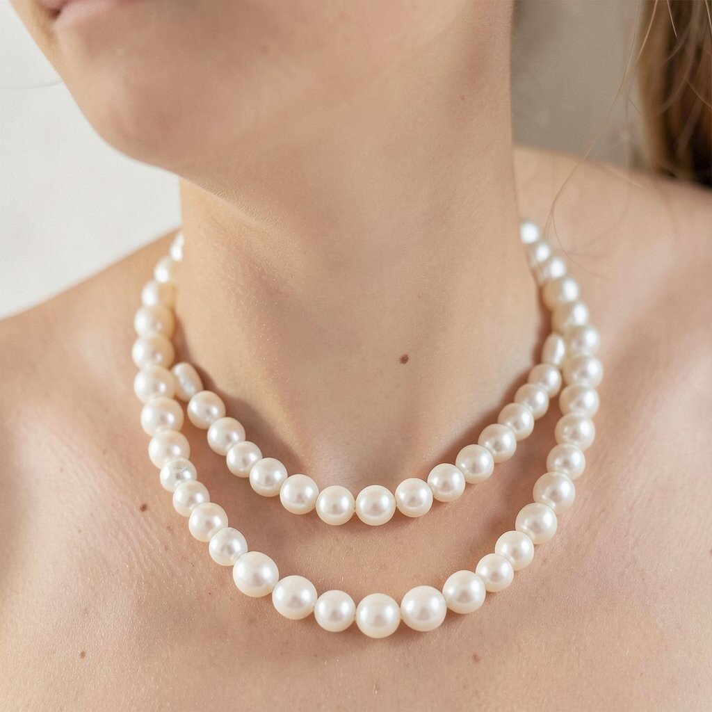 The pearls are usually strung tightly around the neck, giving a sophisticated look. They come in various shades, from traditional white to pink or black. Each shade can be chosen to match your personal style or mood.